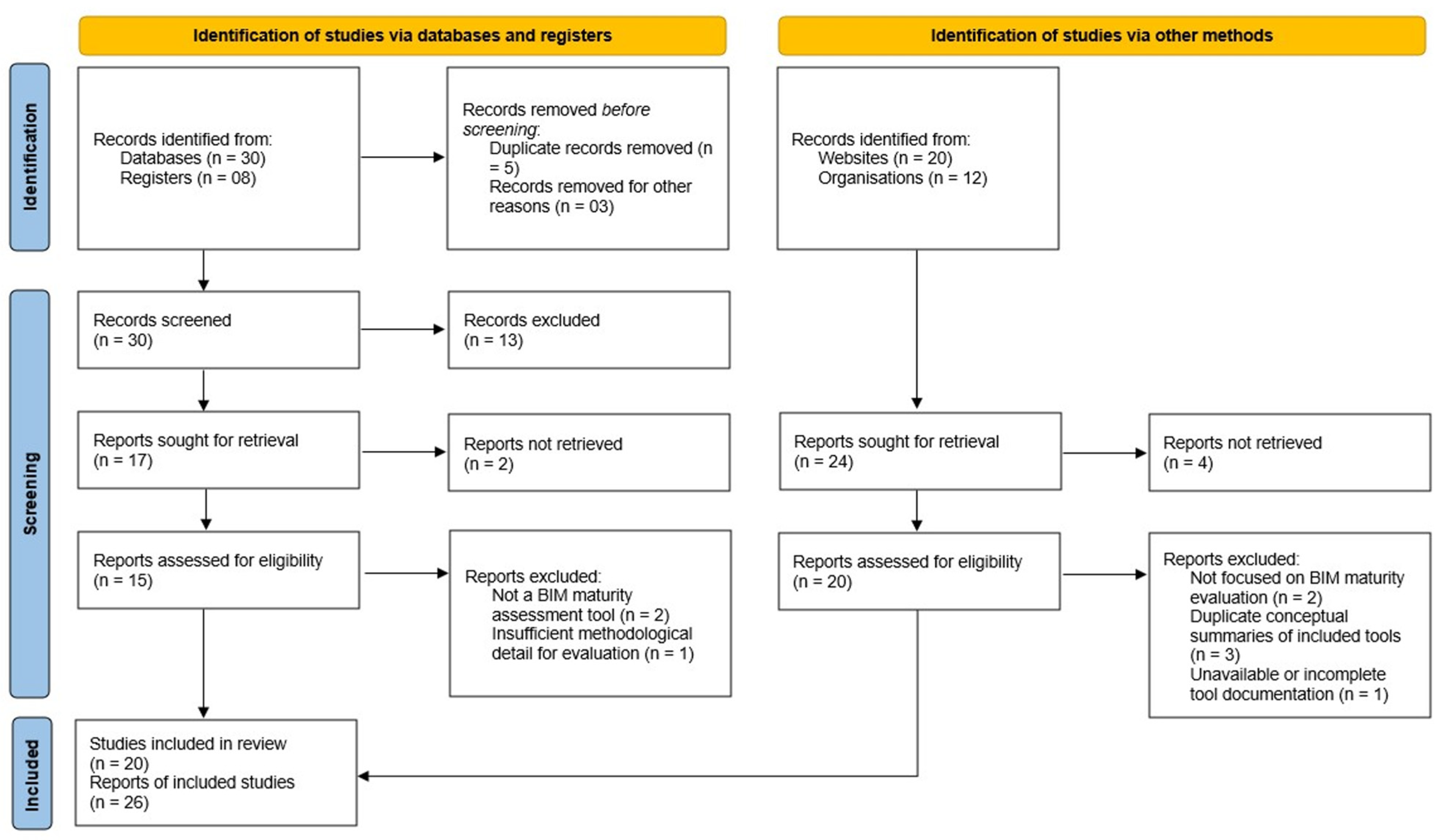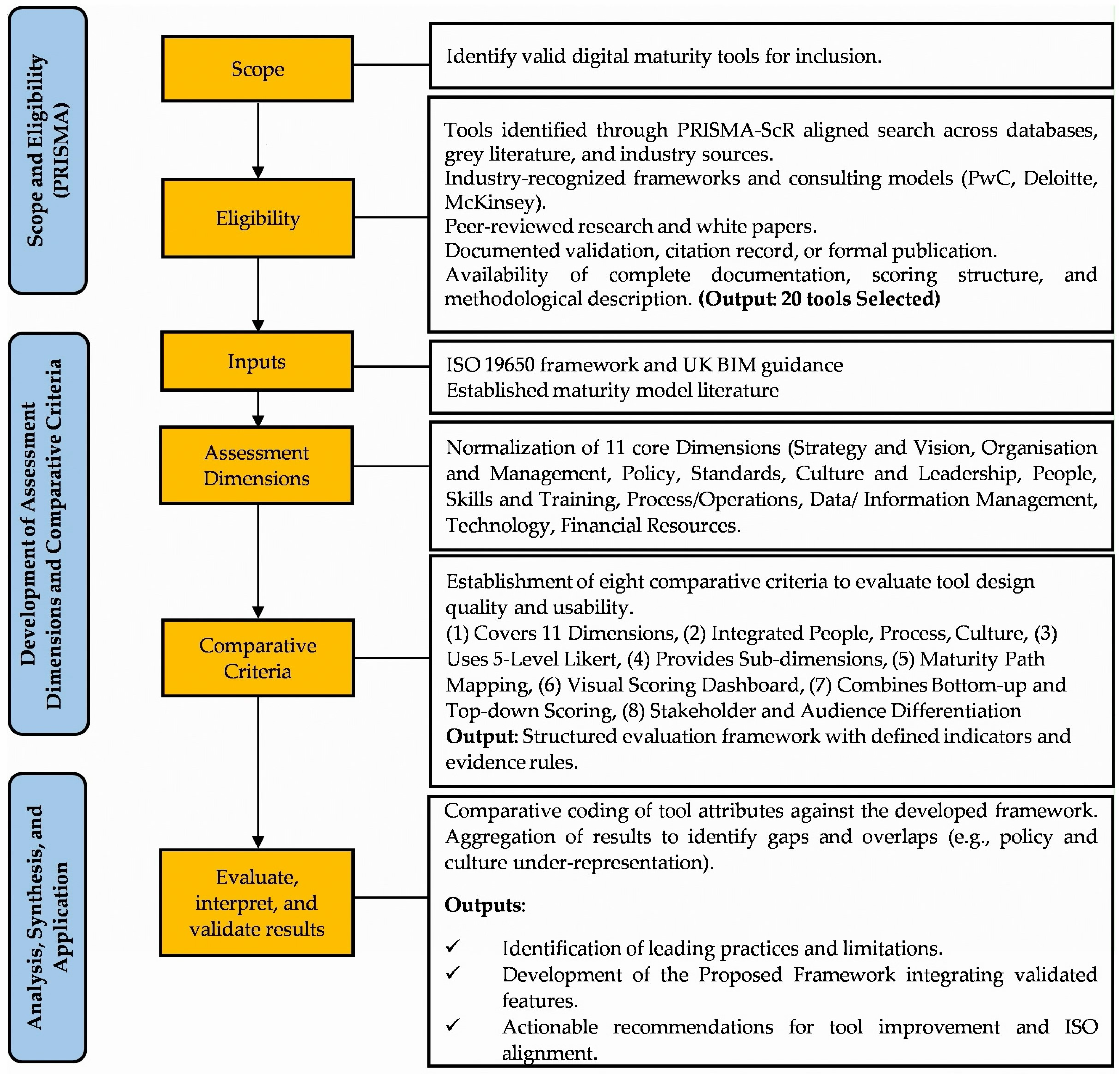 - Availability of Detailed Literature: Each included tool had at least one primary source (peer-reviewed article, standards/technical document, or an official white paper/user guide) that discloses scope, structure, and scoring so methods are auditable (e.g., BIM-CAREM in Computers in Industry 2019/2023; BIM-MM in IGI Global 2010; BIM Cloud Score in ASCE J. Constr. Eng. Manage.; VDC BIM Scorecard in the CIFE technical report; TM Forum/Deloitte DMM in TMF documentation; BCG DAI and McKinsey DQ on official portals). Tools lacking primary source were excluded.
