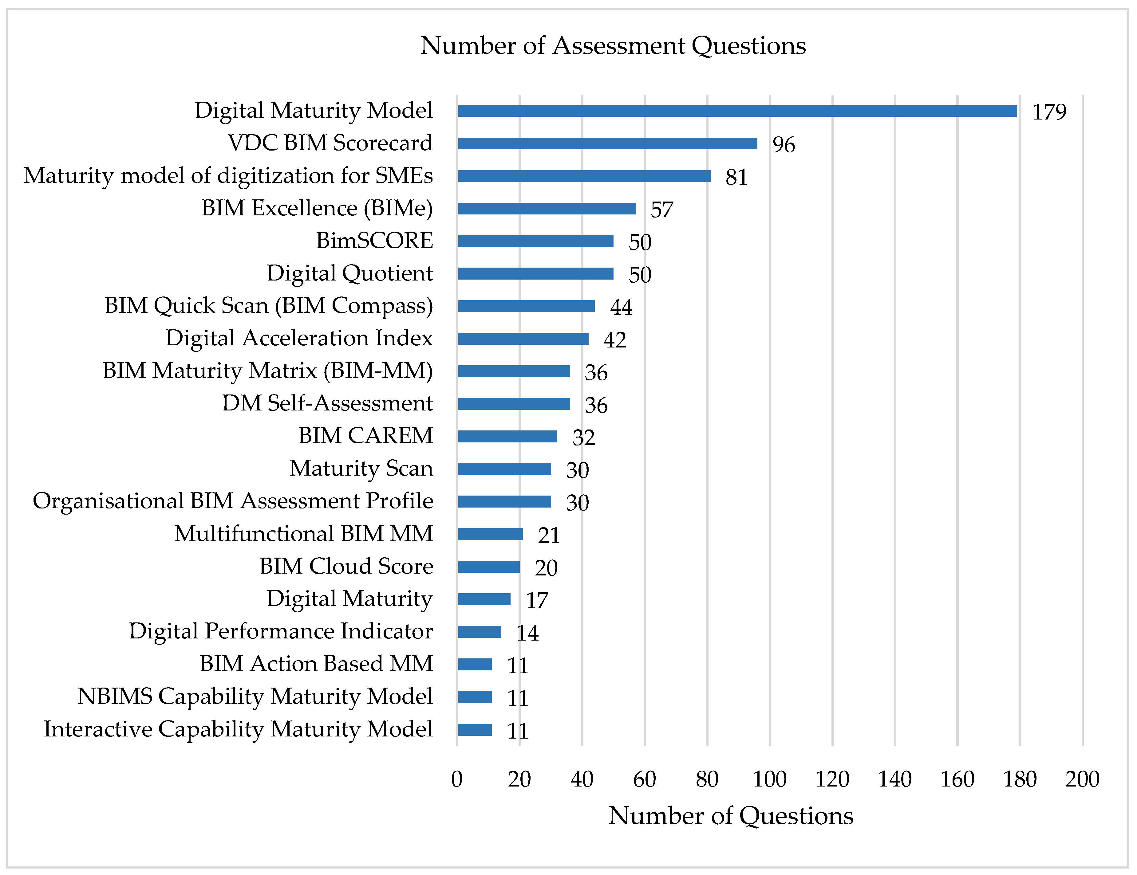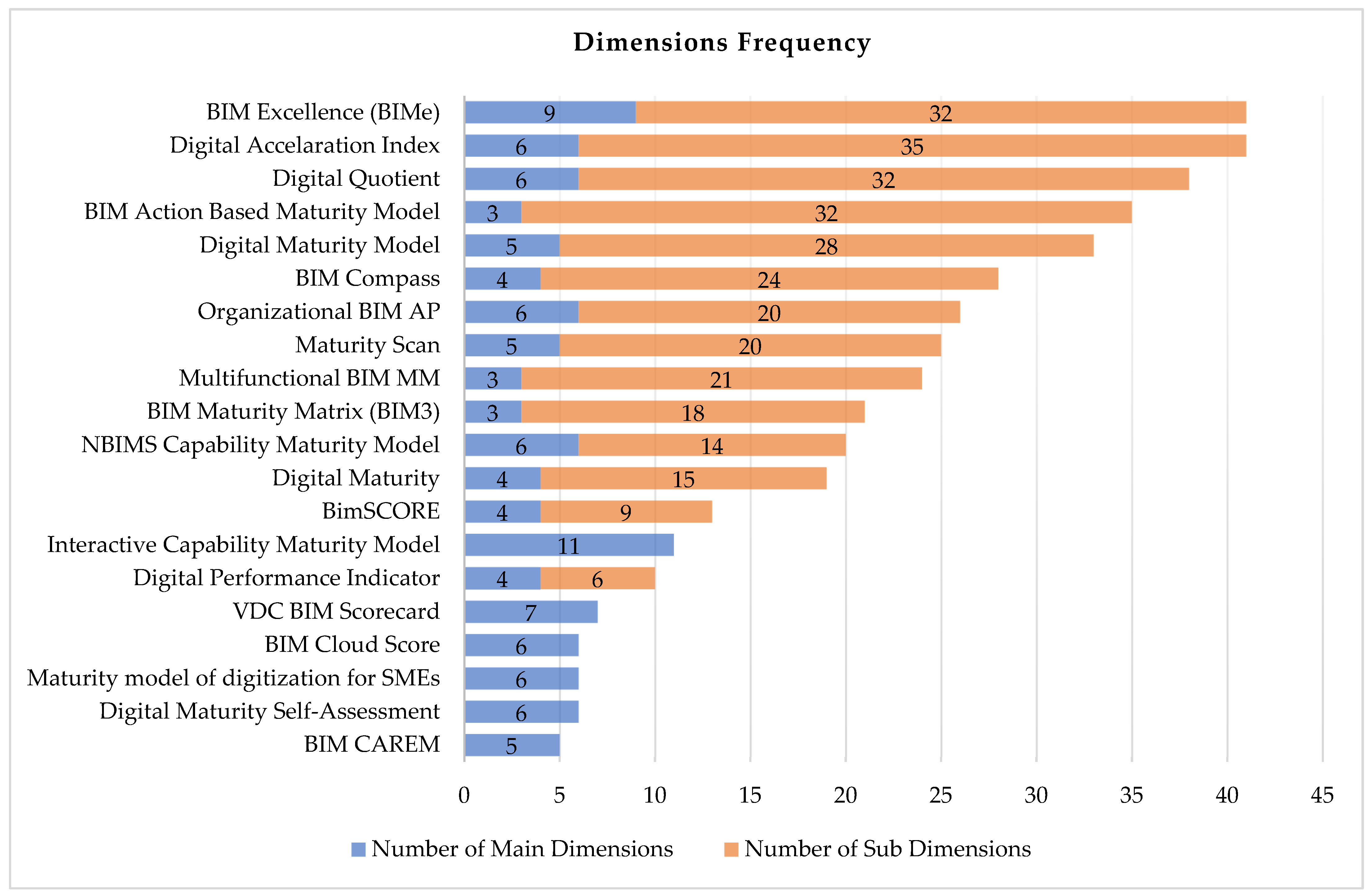 - Eleven Dimensions: To ensure methodological consistency and representativeness, a detailed content analysis of existing BIM and digital maturity frameworks was undertaken prior to defining this criterion. The analysis compared recurrent constructs across international standards (ISO 19650) and benchmark models such as the Maturity Scan, BIM Maturity Matrix, BIM Quick Scan, and VDC Scorecard. Through iterative synthesis, overlapping themes were consolidated to avoid redundancy, resulting in a stable set of eleven key maturity dimensions. This number reflects a balanced and comprehensive structure that captures all critical socio-technical aspects spanning strategy, organisation, technology, people, process, and governance without unnecessary fragmentation. The inclusion of eleven dimensions aligns with findings from established maturity matrix research, which emphasizes complete yet manageable domain coverage to ensure meaningful benchmarking [39,40]. The complete list and criteria for selecting these dimensions are explained in Section 5.5.