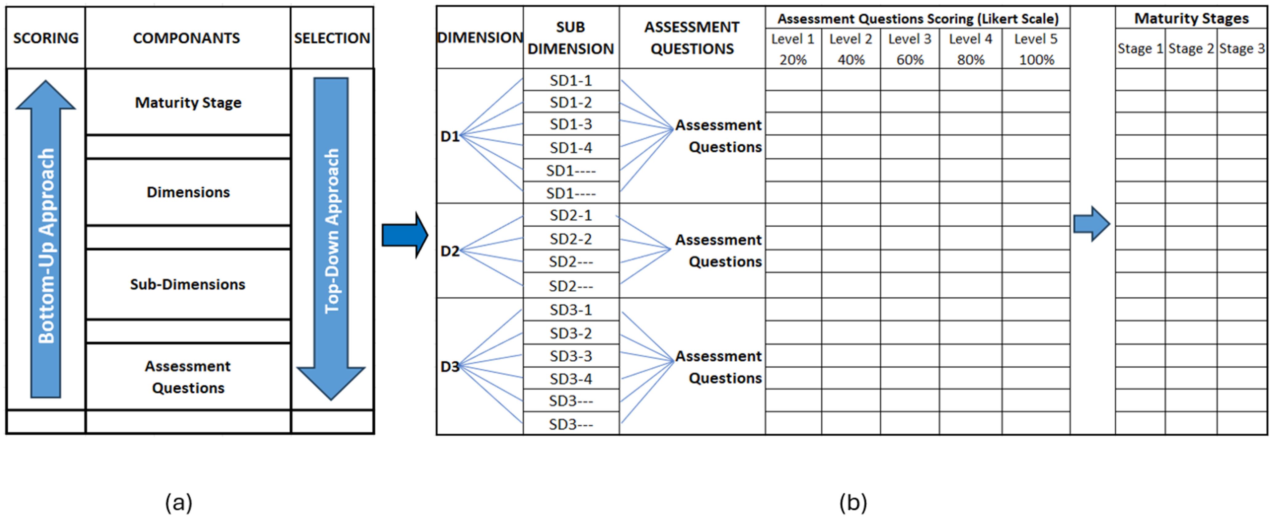 - Combines Bottom-up and Top-down Scoring: Evidence that granular indicator scores (bottom-up) are aggregated to higher-level dimensions or strategic objectives (top-down) using an explicit schema. The logic follows hierarchical evaluation in maturity and multi-criteria decision frameworks where local measures roll up to composite judgments [48] and staged/continuous capability representations [45].