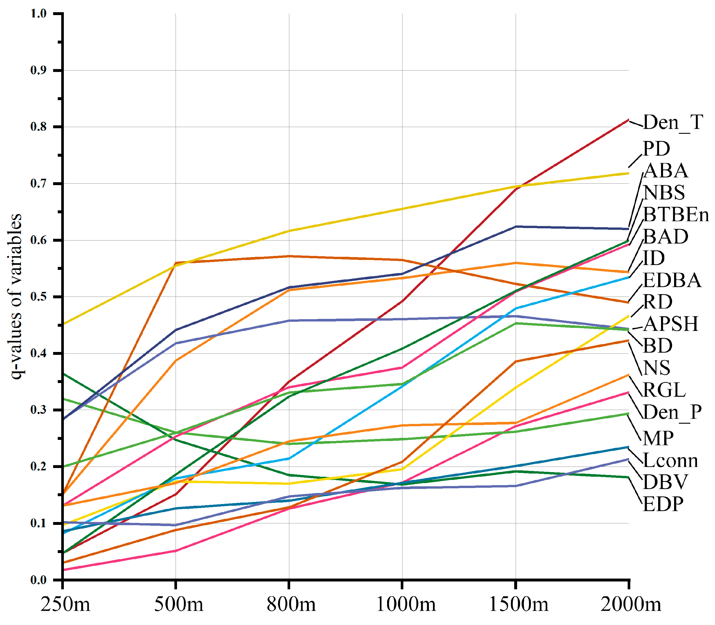 - Structural characteristics of POIs (MP and EDP). Moderate functional mixing enhances vitality, whereas excessive singularity or a lack of functional dominance leads to insufficiency. Appropriately balanced POI mixing and evenness are known to promote pedestrian and leisure activities, thus attracting more foot traffic [77]. However, hyper-diversification without prominent features can blur an area’s functional positioning, resulting in an adverse impact on the development of local vitality.