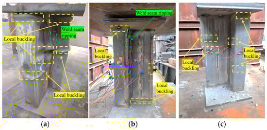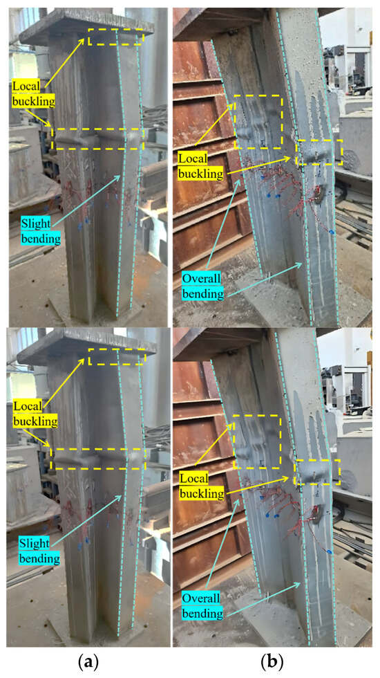 Figure 6 depicts the failure modes of each unequal limb specimen. No visible damage occurred from the start of loading to near 80% of the peak load, indicating an elastic response. However, as the load increased to about 95% of the peak load, the steel pipe attached to the end plate started to bulge locally. Finally, after reaching the peak load, the load quickly started to decrease. Multiple bulging bands gradually formed on multiple surfaces of the steel pipe, and the specimen entered the failure stage. Weld seam ripping was evident in A2 and B2 specimens. As shown in Figure 6, all specimens failed due to local buckling of the steel tube, indicating a strength-dominated failure mode, which is consistent with the findings reported by Wang [5]. For clarity, the definition of the peak load is given in Section 4.1.