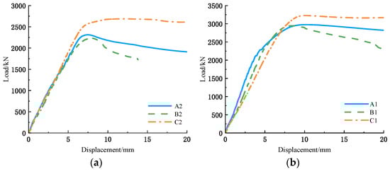 Figure 10a compares the load–displacement curves of specimens A2, B2, and C2 to examine the influence of cross-section form on the axial compression behavior of unequal-limb specimens. As presented, the three types of specimens exhibited comparable initial stiffness, indicating that different cross-section forms have minimal effect on the initial stiffness in unequal limb specimens.