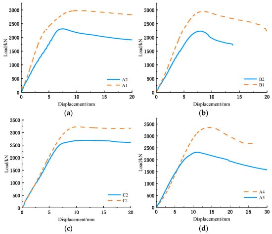 For A-type and B-type specimens, the load–displacement curves of the unequal limb specimens showed a steeper and more pronounced post-peak decline, while the equal limb specimens exhibited a more gradual reduction in bearing capacity, indicating improved deformation capacity. For C-type specimens, the post-peak decline was not obvious within the tested displacement range, and the curves remained relatively flat, which suggests that the C-type configuration can effectively delay the onset of significant strength degradation, especially when combined with a balanced limb length ratio.