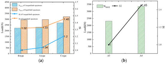 The SI values of all specimens are listed in Table 3, and Figure 12 presents a comparison of the SI values among the specimens. For specimens with different cross-section forms, the peak load of specimens A2 and C2 increased by 4% and 20% compared to specimen B2, respectively. Similarly, the peak load of A1 and C1 was about 1% and 13% higher than that of B1. The comparisons clearly show that, under both equal limb and unequal limb conditions, the C-type specimens exhibit the highest peak load, followed by the A-type, while the B-type specimens have the lowest capacity.