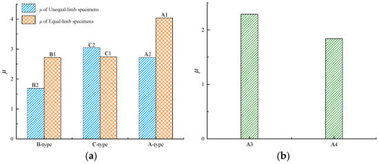 For both A-type and B-type specimens, the coefficient μ of specimens with a limb length ratio of 1 is markedly improved relative to that of specimens with a limb length ratio of 1.5. μ of the specimen A1 increases by 48% compared to A2; μ of the specimen B1 increases by 61% compared to B2. The results indicate that a balanced limb length configuration not only enhances bearing capacity but also provides more stable post-peak deformation. However, the displacement ductility of C-type specimens shows a slight decrease. This is due to the fact that the test was terminated after the axial distortion of the specimen reached around 20 mm, although there was no noticeable downward trend in the C-type specimen at this time. As a result, as for the C-type specimens, de in the coefficient μ is defined as the final displacement under loading rather than the corresponding displacement when the bearing capacity of the specimen is reduced to 85% of the peak load.