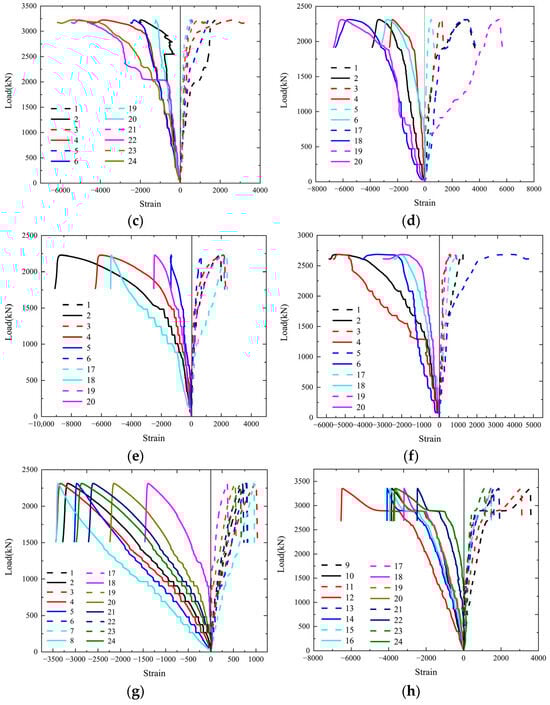 Load–strain curve of each specimen’s middle section: (a) A1; (b) B1; (c) C1; (d) A2; (e) B2; (f) C2; (g) A3; (h) A4.