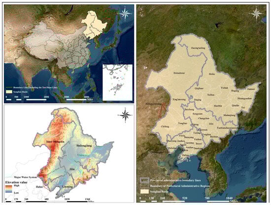 The Songliao River Basin is one of the nine major river basins in China, located in its northeastern region [22]. The administrative divisions of the basin include Liaoning, Jilin, and Heilongjiang provinces, the four eastern leagues (prefecture-level cities) of the Inner Mongolia Autonomous Region, and a portion of Chengde City in Hebei Province. The topography is mainly plains and mountains, bordered by the Bohai Sea and the Yellow Sea to the south, with the Liao River and Songhua River systems flowing through the basin (Figure 1). Its population includes 43 ethnic minorities including the Man, Mongolian, and Korean. Its unique geographical environment and diverse ethnic minority cultures have fostered abundant religious cultures [21]. This study focuses on 1288 registered religious sites in the Songliao River Basin, including temples, Taoist temples, mosques, churches, and other fixed religious venues. Of these, 1143 are Buddhist and 145 are Taoist.