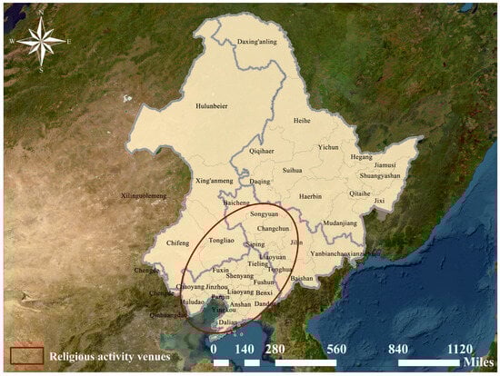 Within geography, religion has emerged as a significant research topic, developing into a specialized sub-discipline: the geography of religion [2,3,4]. Current research is divided into three aspects: First, early foundational studies on the basic framework, origins of the geography of religion. For instance, Sopher established the fundamental research framework for the geography of religion [5], covering core topics such as the origins, diffusion, and spatial relationships of religions; Peach emphasized an empirical research orientation, which remains the mainstream in this field [6]. Second, the spatial evolution of religious sites. For example, TANG Yifan et al. explored the spatial patterns and diffusion models of China’s four major religions from temporal and spatial dimensions, revealing developmental disparities across different types of cities [7]; Orlando Woods notes that religious sites exhibit different spatial distribution patterns amid urban development [8]. Third, factors influencing the spatial distribution characteristics of religious sites are explored. For instance, CHEN Junzi et al. identified historical economic development levels, socio-cultural environments, and governmental religious policies as key factors influencing the spatial distribution of religious architectural heritage [9]; XUE Ximing et al. found that the spatial distribution of Christian churches in Guangzhou was mainly influenced by transportation and demographic factors [10]; In summary, the factors and formation mechanisms influencing the spatial distribution characteristics of religious sites are highly complex, and studies in different geographical contexts may lead to different conclusions. Currently, some domestic scholars have proposed exploring the impacts of natural environments, socio-economic factors, and cultural development on the spatial distribution of religious sites from perspectives of prefectural-level cities [11], provincial-level regions [12,13,14], and specific zones [15], bringing a diversified trend to research. However, some limitations remain. On one hand, many studies examine the factors affecting the spatial distribution of religious sites separately, which hinders prevents comprehensive exploration of their partial distribution characteristics and influence mechanisms. On the other hand, due to factors including historical and cultural foundations, economic development priorities, and data availability [16], domestic research has mainly focused on southeastern coastal China and northwestern regions, while studies on the northeastern region remain relatively limited [17,18]. This study focuses on northeastern China, aiming to analyze the spatial distribution characteristics and influencing mechanisms of religious sites, thereby providing a valuable supplement to domestic research on religious sites.