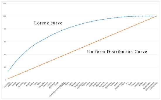 KDE and SDE characterize the agglomeration locations and patterns of religious sites’ spatial distribution, but cannot directly provide a single, clear numerical value to indicate how imbalanced their distribution is across prefecture-level cities. This study introduces the II to reflect the equilibrium degree of religious site distribution in the Songliao River Basin. It calculates the II (S) using the concentration index formula derived from the Lorenz curve [32]: