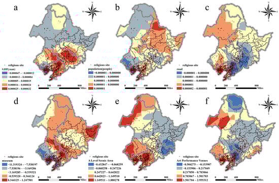 Spatial heterogeneity of socio-economic factors. (a) Spatial distribution pattern of regression coefficients corresponding to the GDP factor; (b) Spatial distribution pattern of regression coefficients corresponding to the population density factor; (c) Spatial layout of the road network density factor’s regression coefficients; (d) Spatial layout of the museum factor’s regression coefficients; (e) Spatial layout of the A-rated tourist attractions factor’s regression coefficients; (f) Spatial layout of the performing arts venues factor’s regression coefficients.