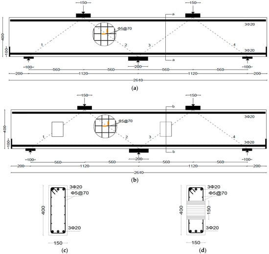 Detailing of continuous beams [14]: (a) CS; (b) R13. (c) Section a-a. (d) Section b-b (unit: mm, rebar strain gages are shown in orange color).