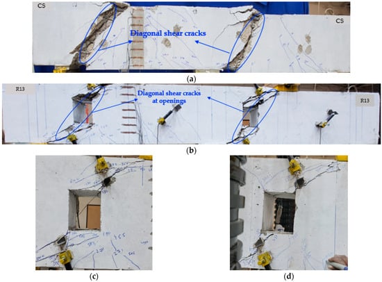 (a) Control beam (CS) at failure and (b) Beam R13 at failure. (c,d) Zoomed views of cracking around left and right openings in beam R13 at peak load [13,14].