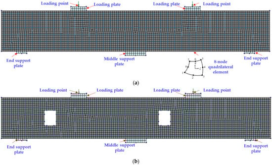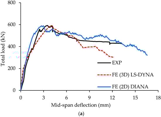 To investigate the effect of varying the number of rectangular openings in an HSC continuous deep beam, a parametric study was conducted using two-dimensional (2D) nonlinear FE analysis. The analysis was carried out on a two-span continuous deep beam using the DIANA 10.5 FE program [19]. The numerical models were validated against experimental results from the authors’ previous studies [13,14] as well as three-dimensional (3D) numerical models developed using LS-DYNA R11 software [20]. Three-dimensional analysis was not pursued for the parametric study, as it typically demands significantly greater computational time, while 2D FE analysis could deliver comparably accurate results.