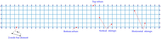 An eight-node rectangular isoparametric plane stress element was adopted for modeling concrete and steel plates. The maximum mesh size was 20 mm, which is 5% of the overall depth of the beam, as recommended in DIANA 10.5 [19]. The FE mesh of the beams is shown in Figure 4. The rebars were modeled using two-node truss elements, as shown in Figure 5.