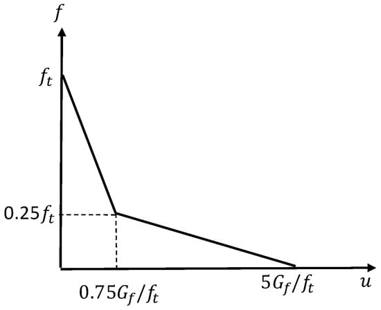 The softening in concrete was modeled using the JSCE tension softening model [25], as shown in Figure 6. It is a bilinear tensile stress-crack width ( − ) curve with a breakpoint at , where is concrete’s tensile strength, and is the concrete’s fracture energy in tension. It reaches zero at a crack opening displacement of . The fracture energy of the concrete, , required to form a unit area of stress-free crack, determines the value of crack opening at complete release of stress. The direct tensile strength of concrete was calculated based on the FIB 2010 [23] equation: