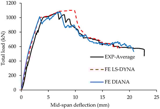 Comparison of experimental and numerically predicted total load-deflection curves of control specimen, CS [13,14].