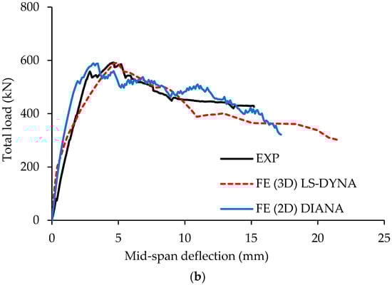 Comparison of experimental and numerically predicted total load-deflection curves of control specimen, R13: (a) left span; (b) right span [13,14].