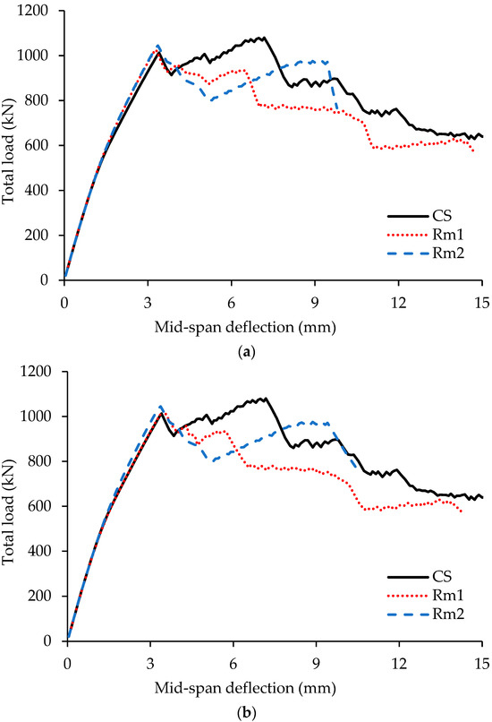 Total load versus mid-span deflection plots for beams CS, Rm1, and Rm2 for: (a) left span; (b) right span.