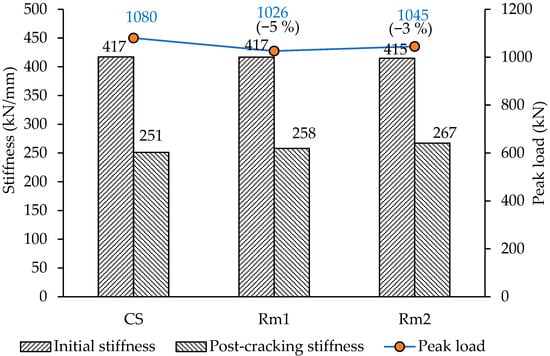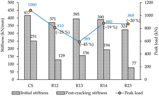 Although the post-cracking stiffness was calculated between the cracking load and the peak load, for the control specimen (CS), the first peak load was used instead of the ultimate peak load. This adjustment was made to enable consistent comparison with other beams, as the CS specimen exhibited a secondary increase in load after an initial drop (Figure 9), likely due to internal redistribution of forces, resulting in a delayed peak at a much higher displacement.