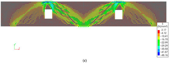Contours of principal stresses in concrete, S (MPa), at peak load for beams: (a) CS; (b) Rm1; (c) Rm2.