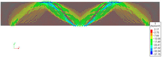 - The experimental failure of the control beam, CS (Figure 3a), shows good agreement with stress contours of FE analysis presented in Figure 11a and Figure 12. The experimental diagonal shear failure cracks developed in the beam correspond to the FE stress paths.