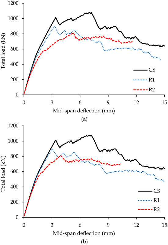 Total load versus mid-span deflection plots for beams, CS, R1, and R2: (a) left span; (b) right span.