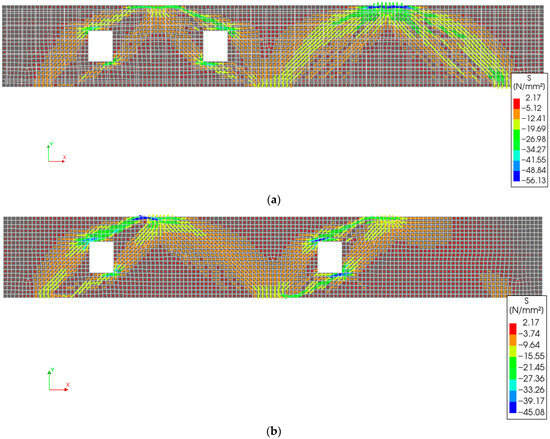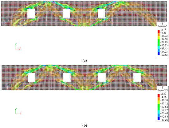 In this study, the openings were introduced post-construction without any additional local reinforcement, leading to pronounced stress concentrations around the opening boundaries, as reflected in the principal stress fields. In practical design, however, engineers typically provide supplementary reinforcement or strengthening to redistribute stresses and maintain continuity of the load path. Such detailing would be expected to reduce stress concentration, delay cracking, and enhance both stiffness and load capacity compared with the unstrengthened configurations analyzed here.