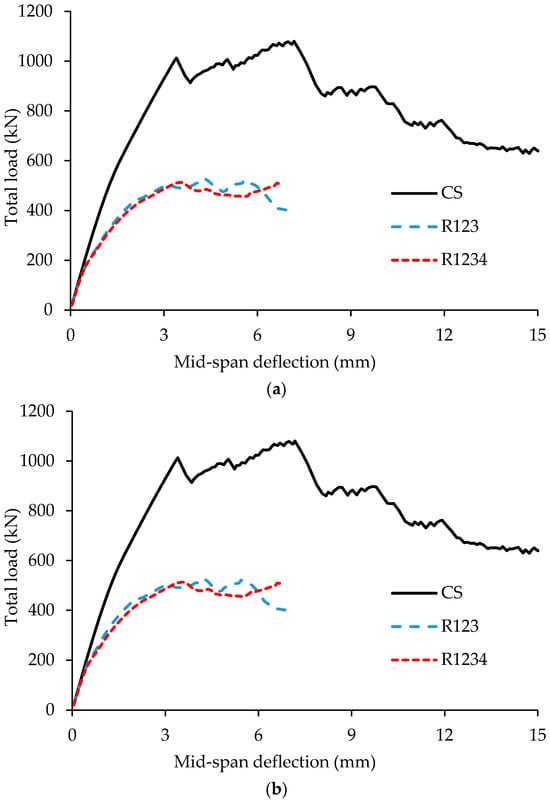 Total load versus mid-span deflection plots for beams, CS, R123, and R1234: (a) left span; (b) right span.