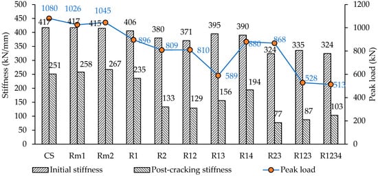 Figure 22. Initial and post-cracking stiffness, along with peak load, for all beams. - Beam R1, with a single opening, experienced a slightly smaller reduction in load capacity (17%) compared to Beam R14, which had two openings (19%) (Figure 22). This small difference, even after adding an opening, is attributed to the symmetrical layout of Beam R14, which facilitated a more balanced load transfer across the spans.