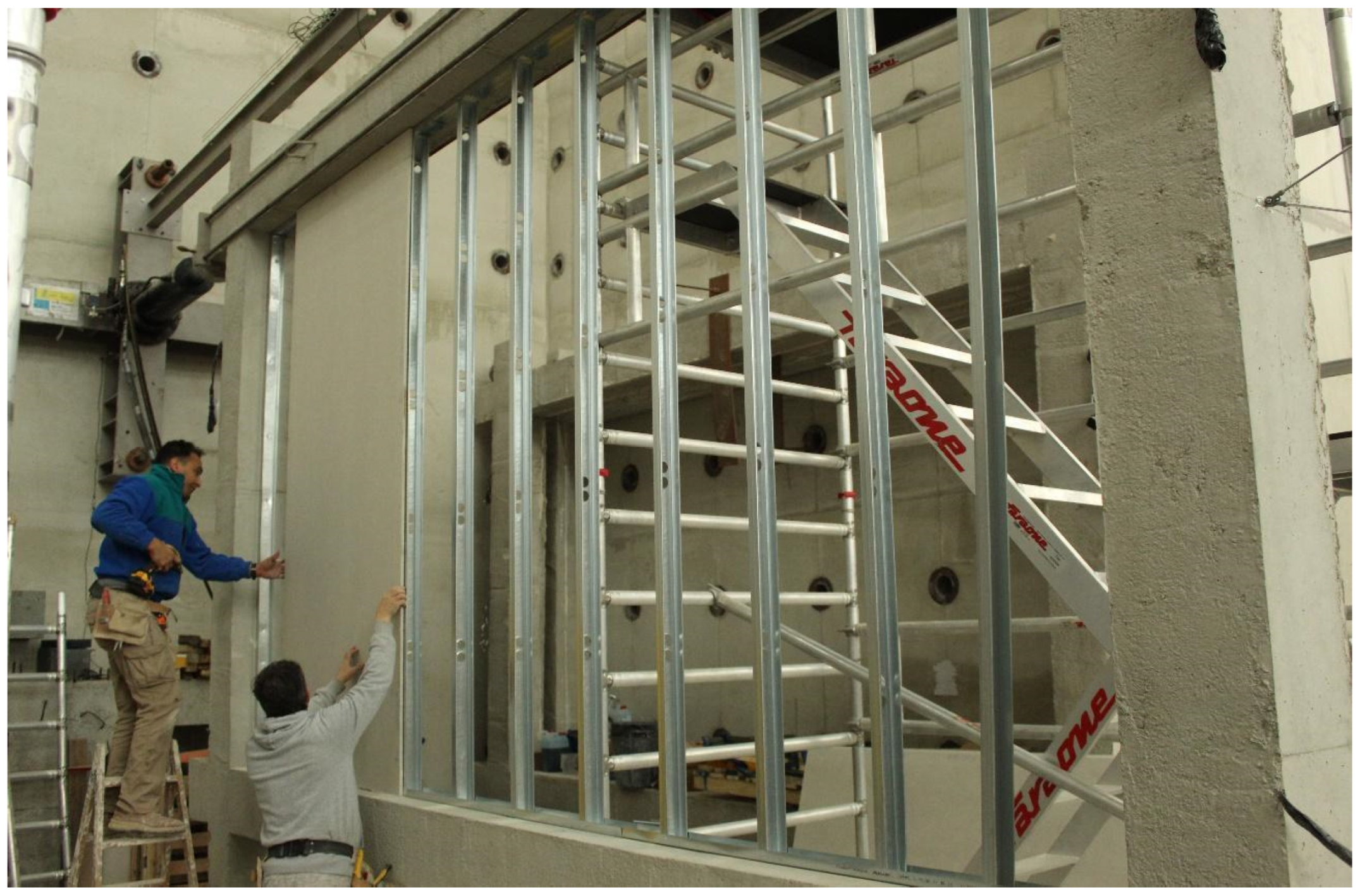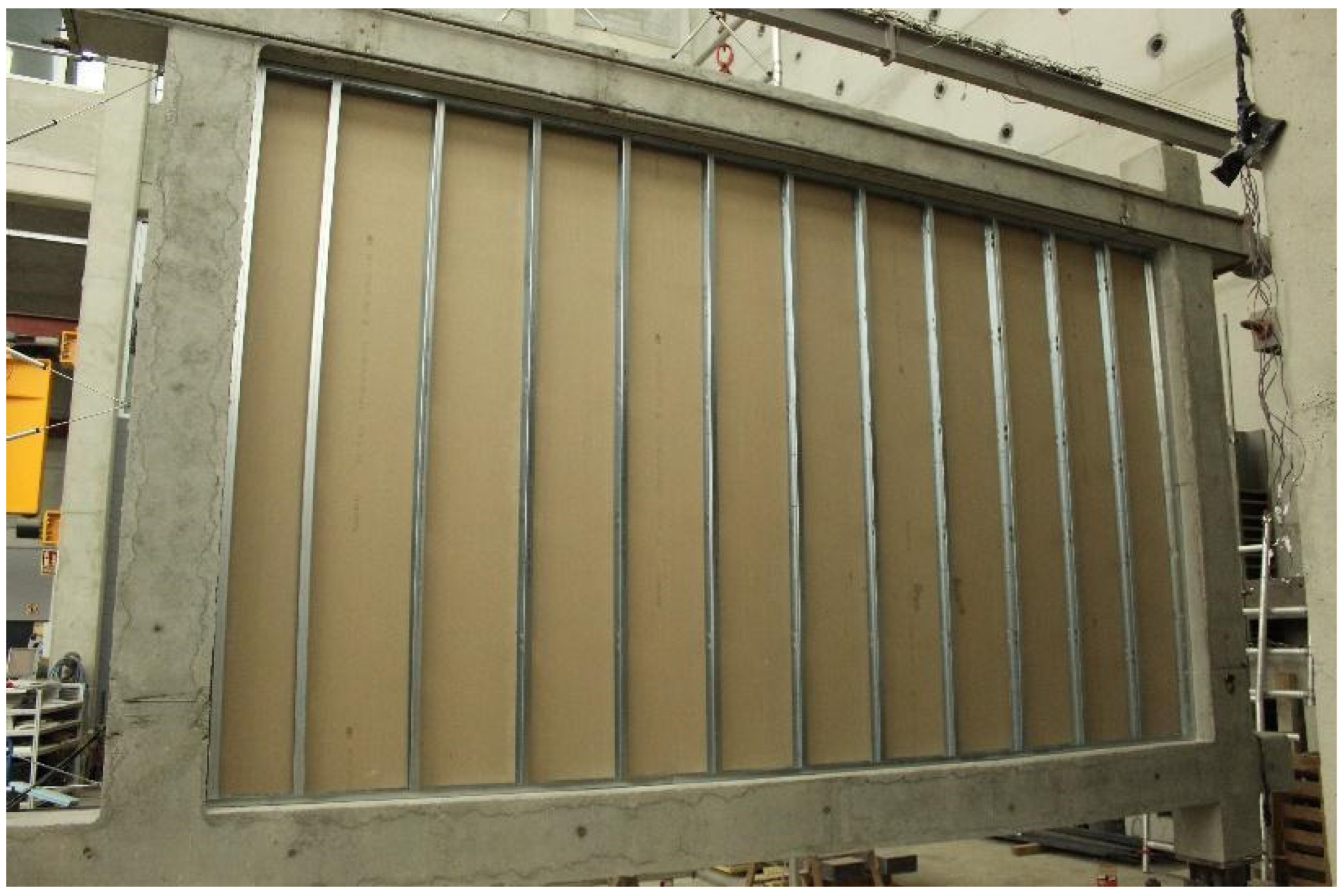 - Infilled Frame: This frame incorporates an interior partition made of plasterboard panels. The infill system consists of two 15 mm thick plasterboard panels applied to each face of a cold-formed steel frame. The cold-formed steel frame is constructed using studs and channels of 70 mm depth (described in detail in Section 3.2). The spacing between the studs is maintained at 400 mm. The cold-formed steel frame is anchored directly to the beams and columns of the structural frame, ensuring interaction during the tests (Figure 5 and Figure 6). This setup (double 15 mm panels on 70 mm studs) was selected to strictly adhere to the installation specifications of the Spanish standard UNE 102043 [21], ensuring representativeness of current construction practice.