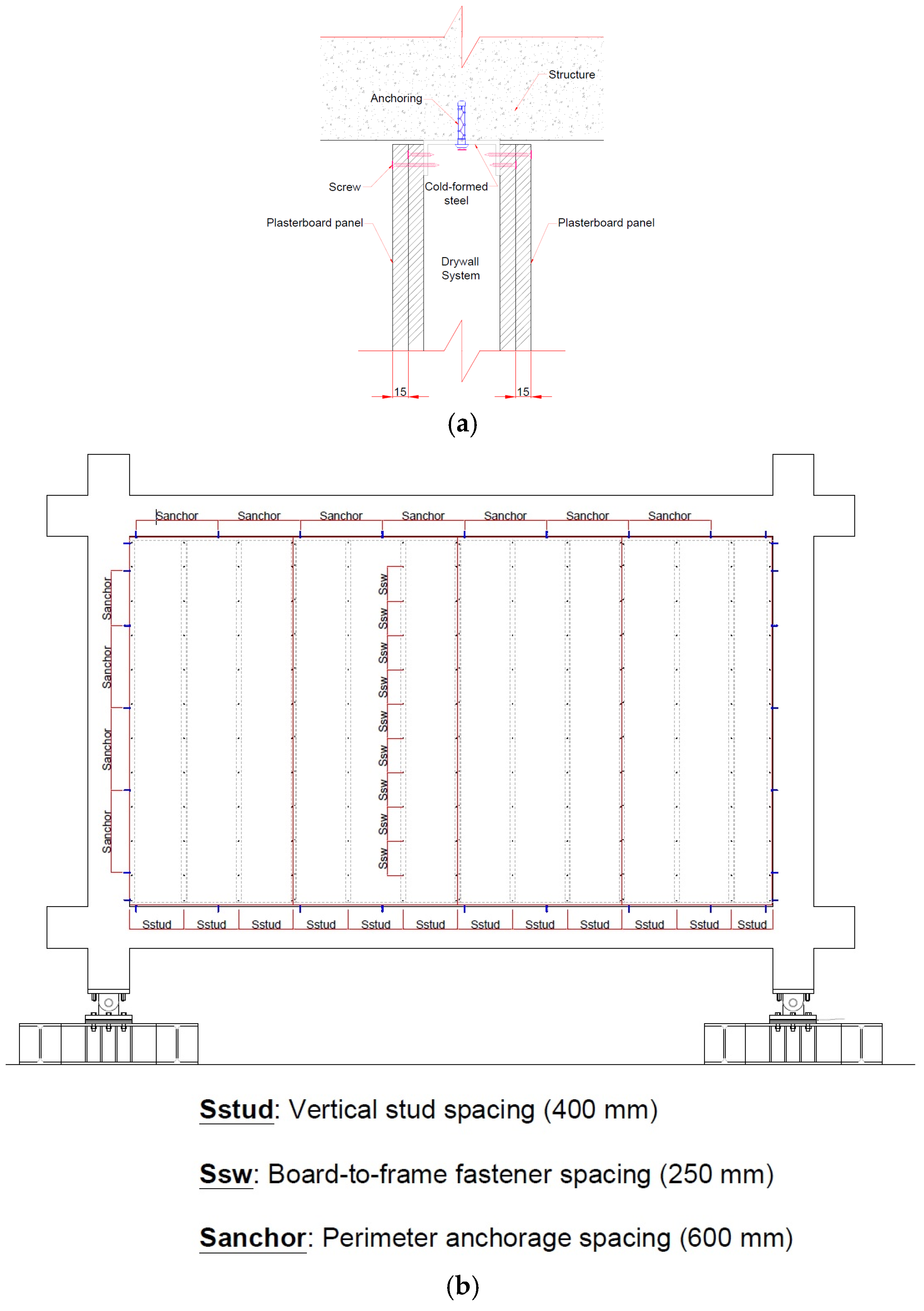 - First, the experimental campaign focused on a specific drywall configuration. This setup (double 15 mm panels on 70 mm studs) was selected to strictly adhere to the installation specifications of the Spanish standard UNE 102043 [21], ensuring representativeness of current construction practice. Consequently, the reported stiffness and strength contributions are specific to this standard assembly; variations in board thickness, stud gauge, or screw spacing—different from those prescribed by the norm—could alter the interaction.