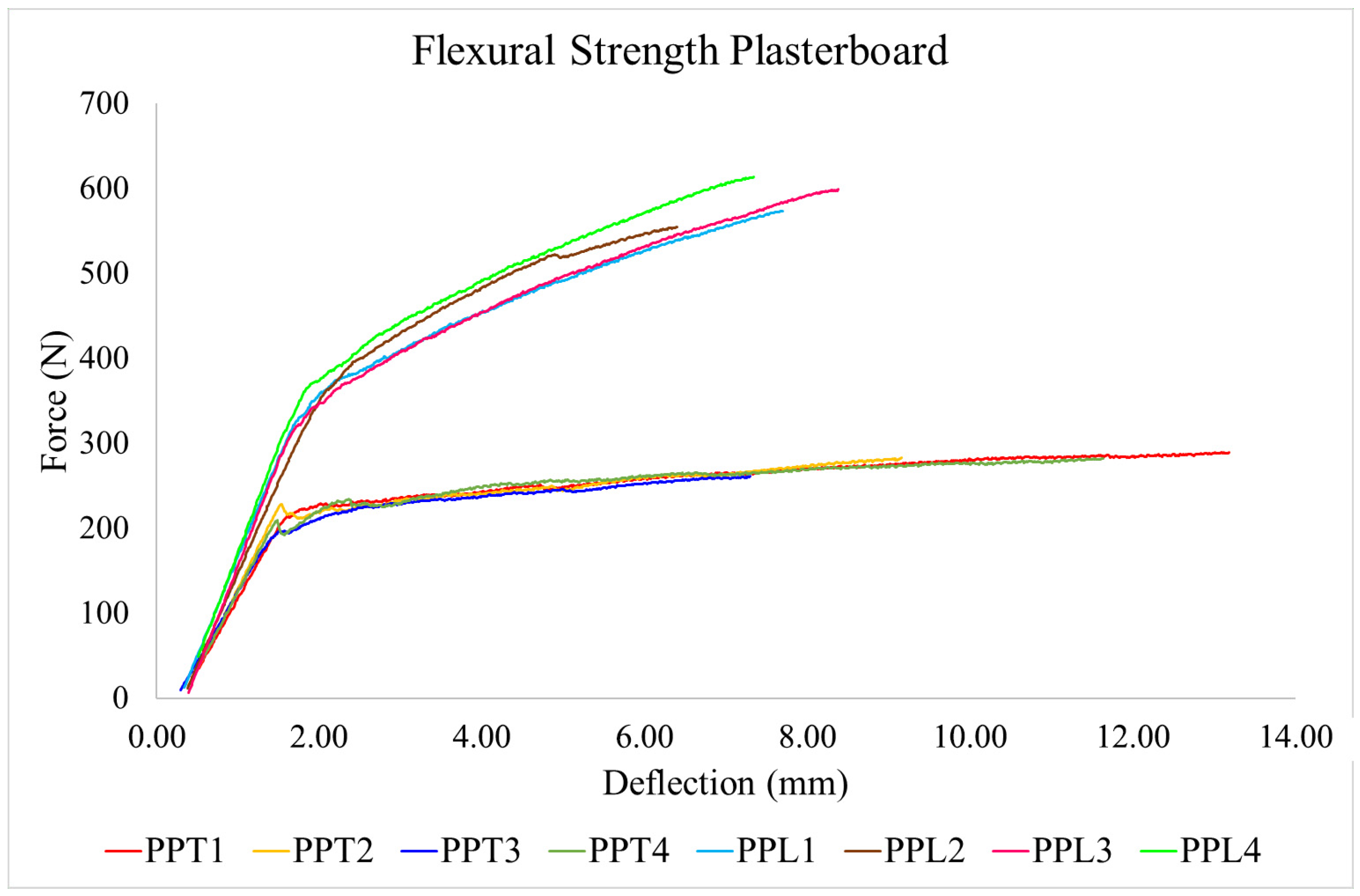 - Despite being a non-structural element composed of brittle materials, the drywall system (plasterboard, screws, and cold-formed steel studs) develops a complex multi-stage load transfer mechanism. It initiates with a transient diagonal strut action at very low drifts, which rapidly and concurrently transitions into a dominant membrane behaviour. This membrane contribution ceases abruptly once the panels fail at an interstory drift of 0.89%.