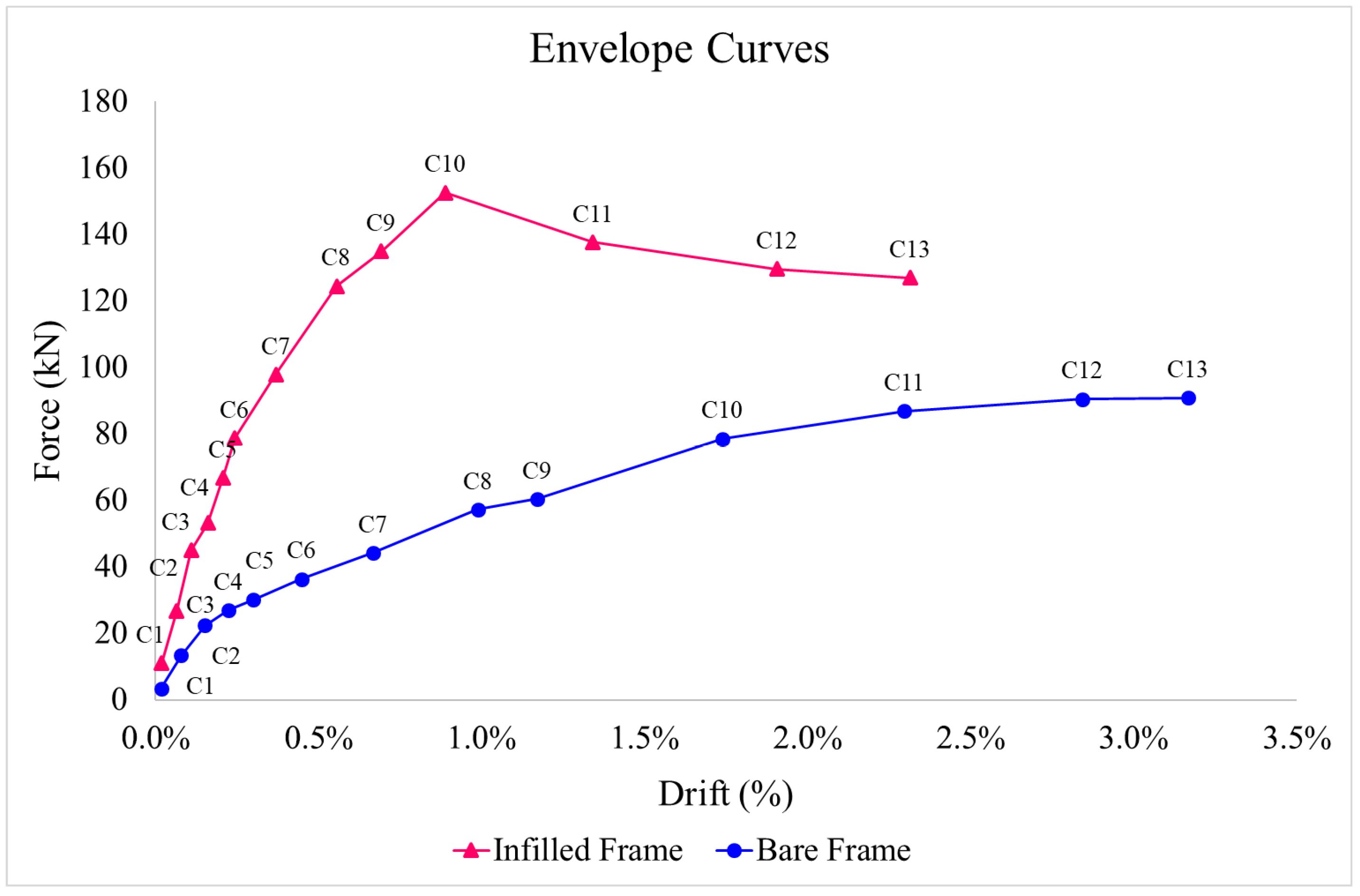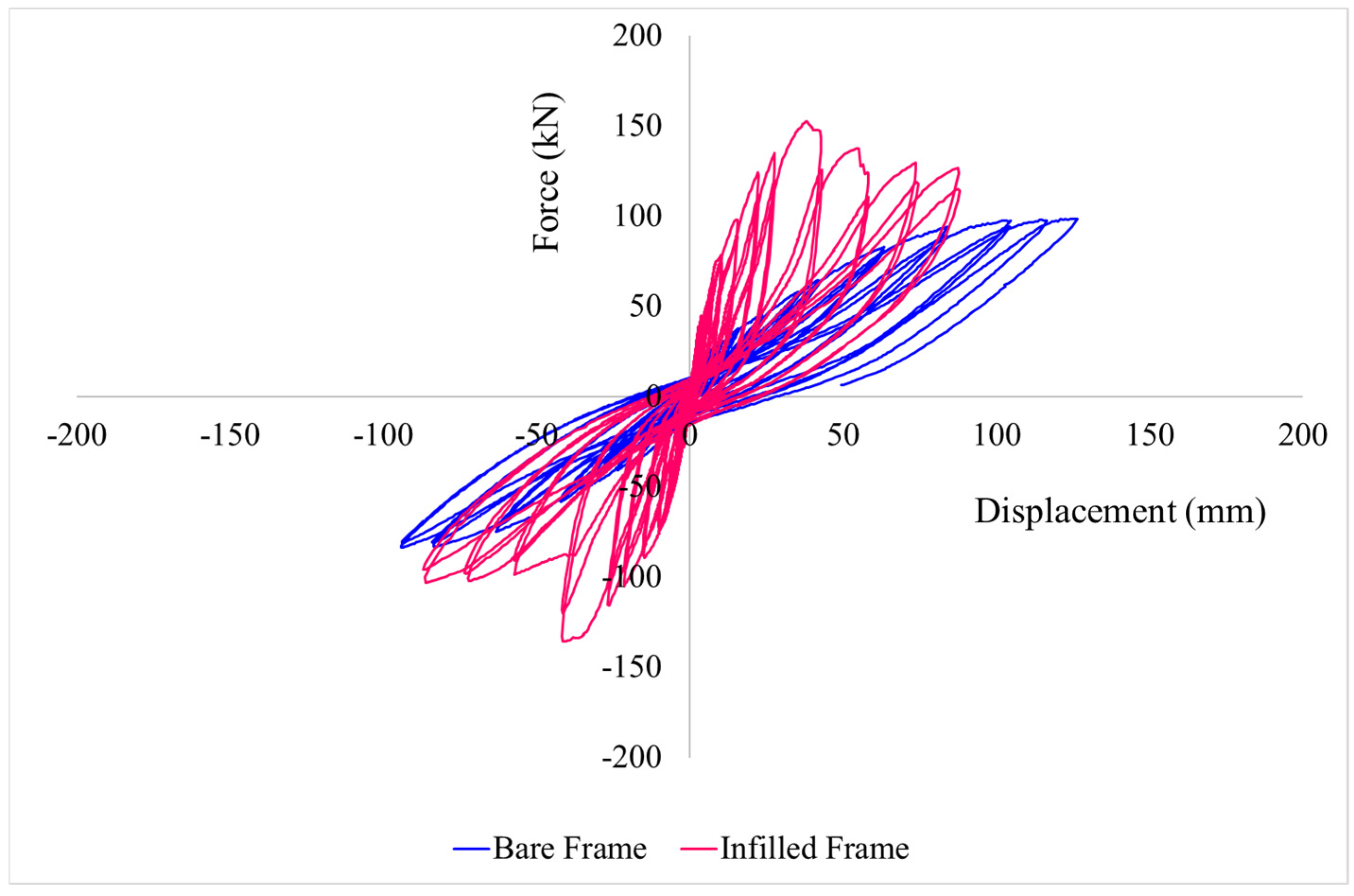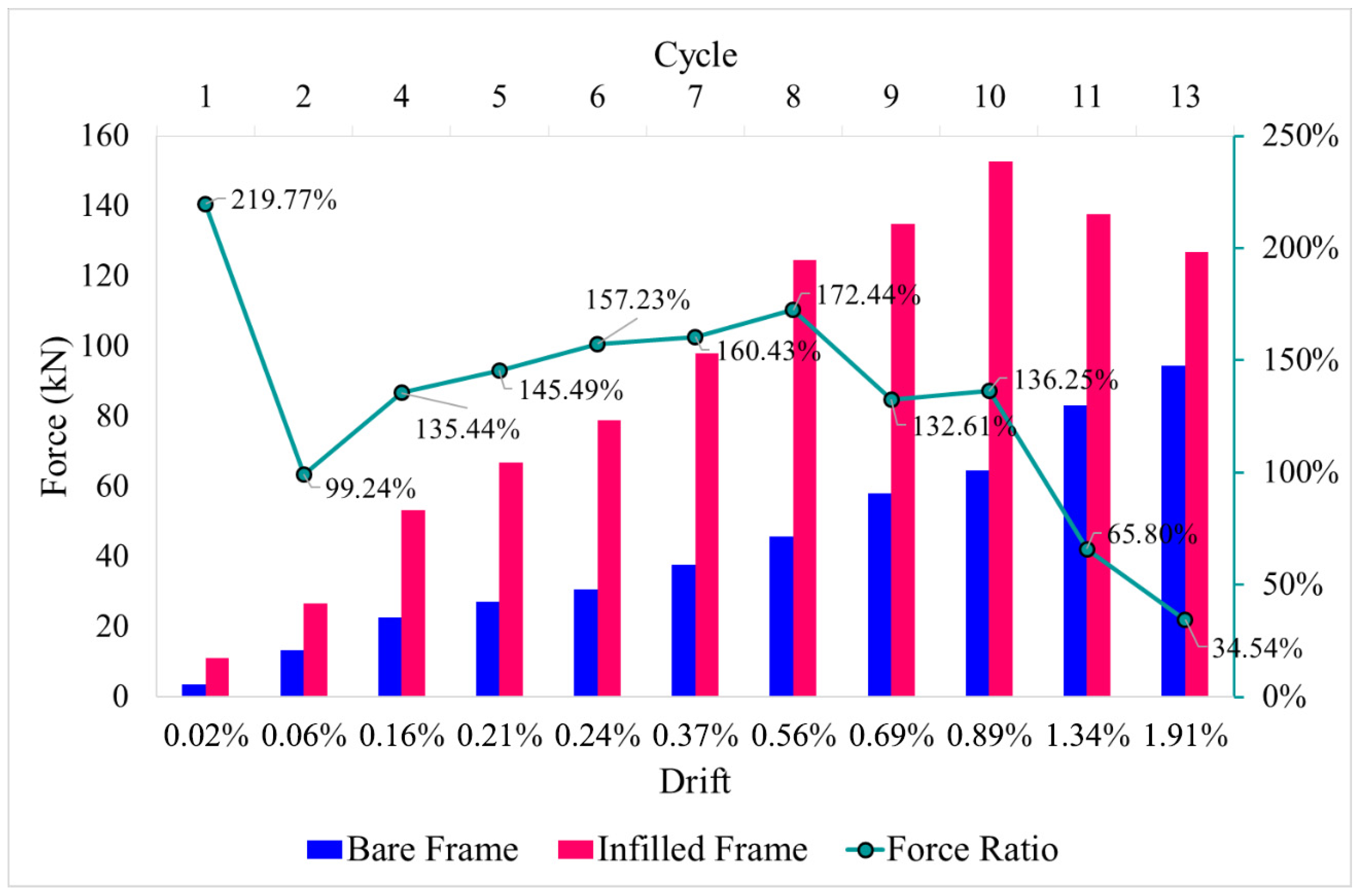 - The presence of the infill fundamentally changes the failure mode of the reinforced concrete frame. The increased stiffness forces the structural elements to resist higher lateral loads for smaller displacements. The infill then fails sequentially, allowing the reinforced concrete frame to replicate the flexural failure mode of the bare frame only in later cycles, with the onset of primary structural damage (flexural yielding) occurring at a higher drift capacity, as evidenced by the absence of cracking in the columns.