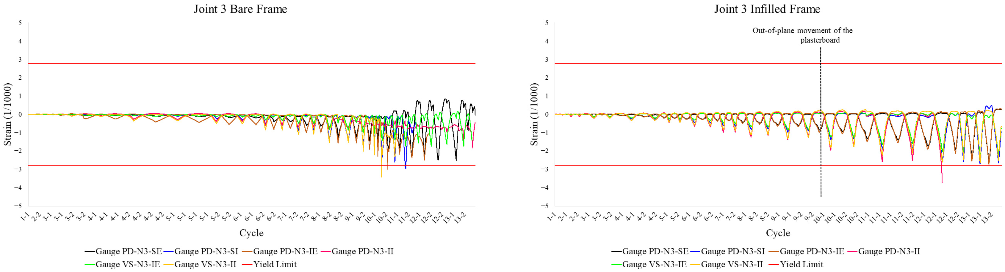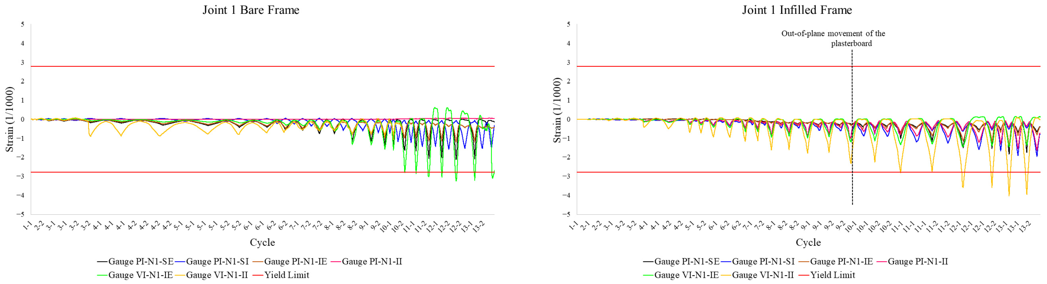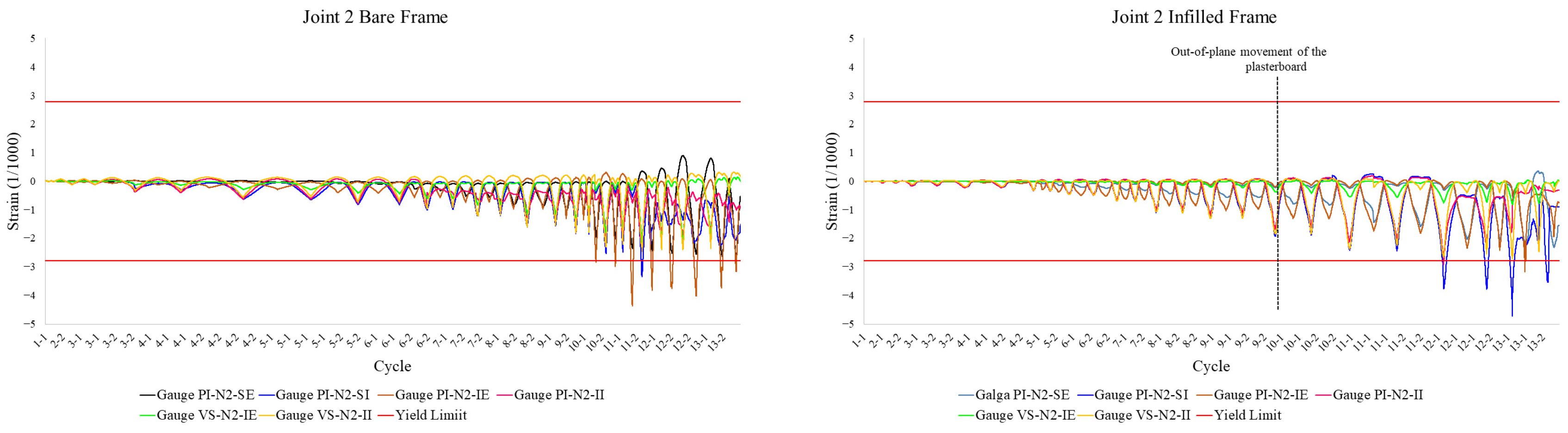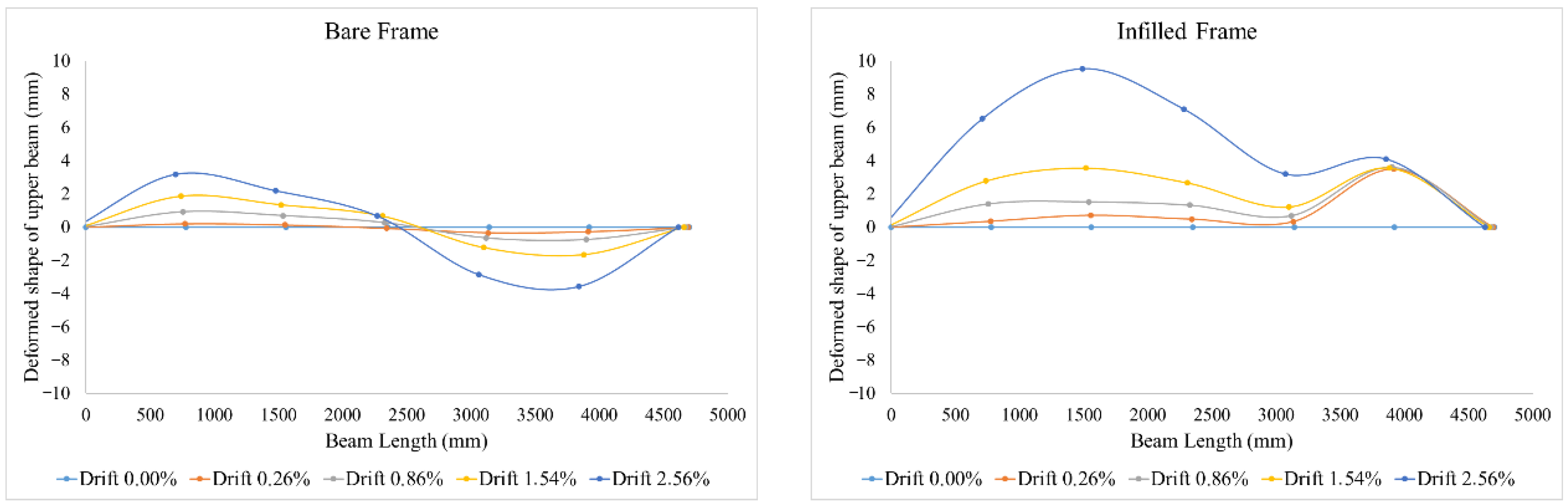 - The presence of the infill fundamentally changes the failure mode of the reinforced concrete frame. The increased stiffness forces the structural elements to resist higher lateral loads for smaller displacements. The infill then fails sequentially, allowing the reinforced concrete frame to replicate the flexural failure mode of the bare frame only in later cycles, with the onset of primary structural damage (flexural yielding) occurring at a higher drift capacity, as evidenced by the absence of cracking in the columns.