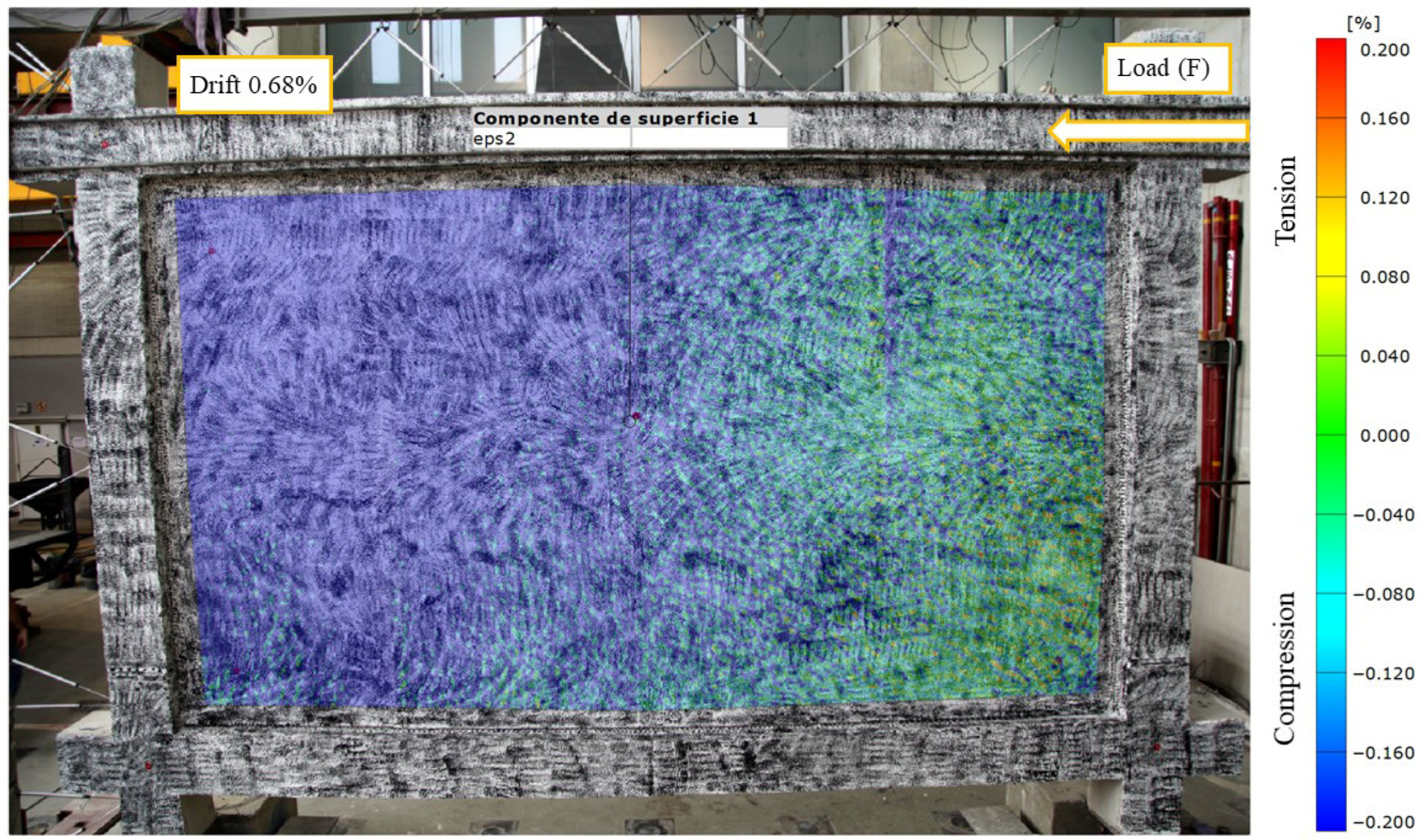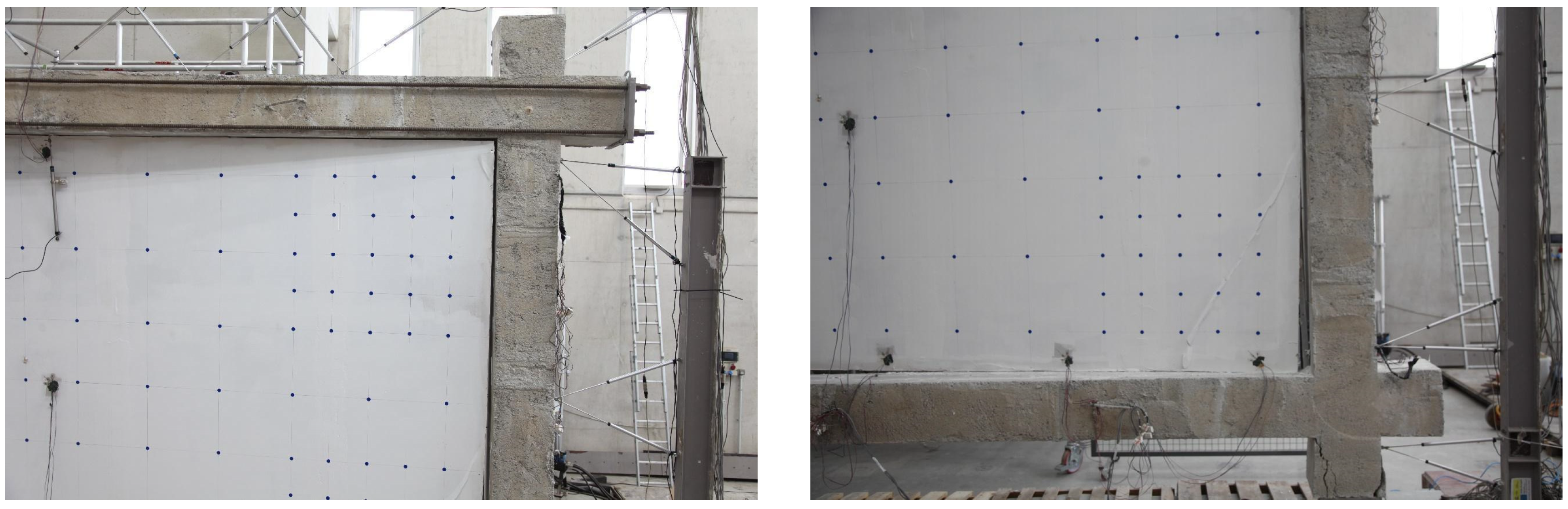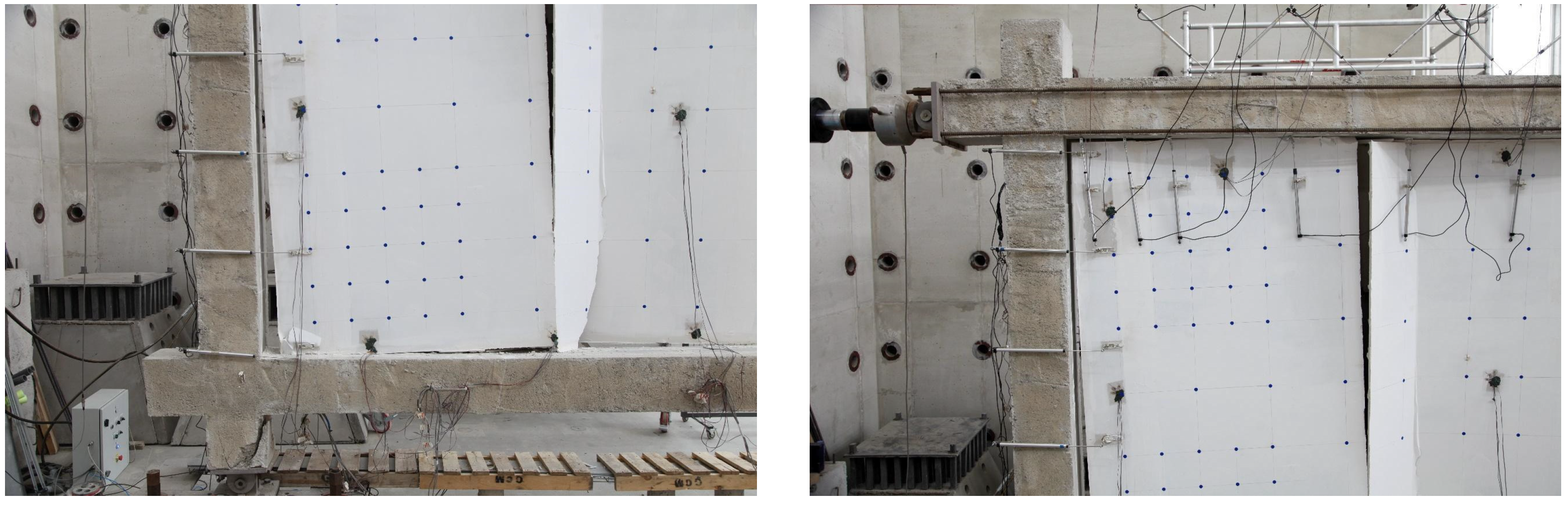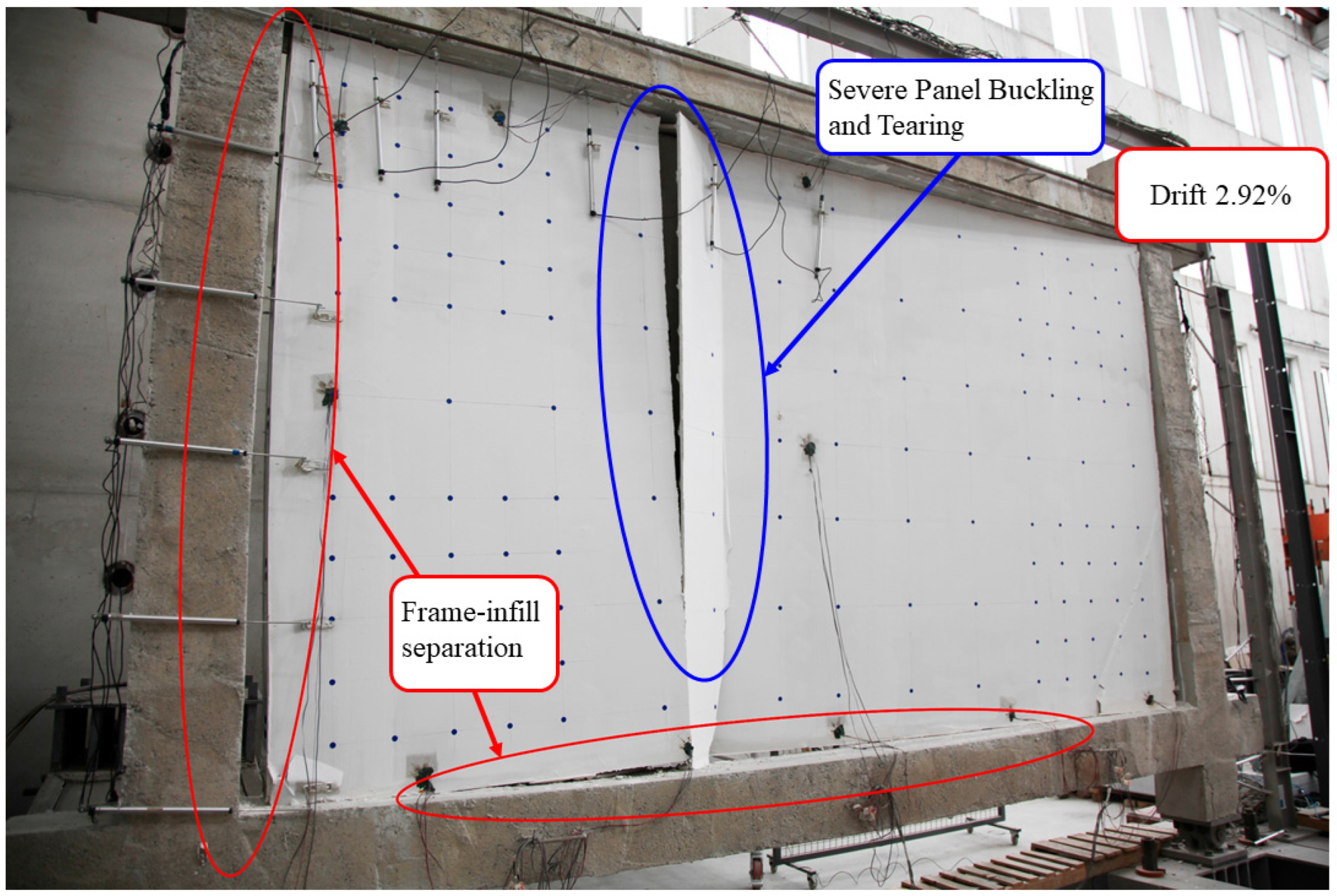 - Finally, the instrumentation setup was primarily designed to capture the in-plane global response (stiffness, strength, and drift). While the failure mechanism of the drywall involved out-of-plane buckling and tearing—inherently 3D phenomena—these were monitored visually and correlated with the in-plane force drop.