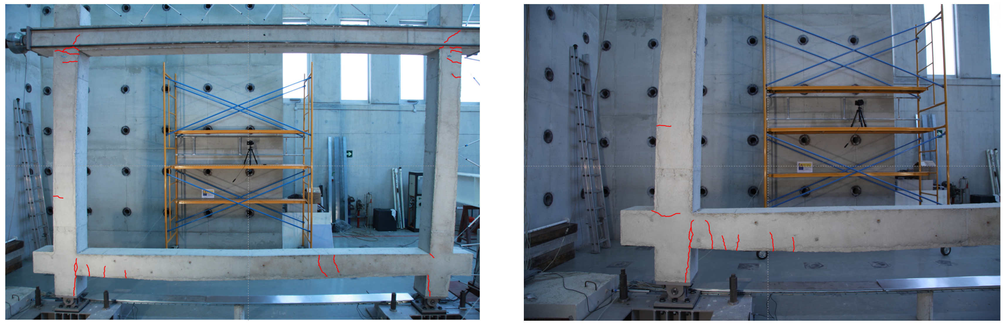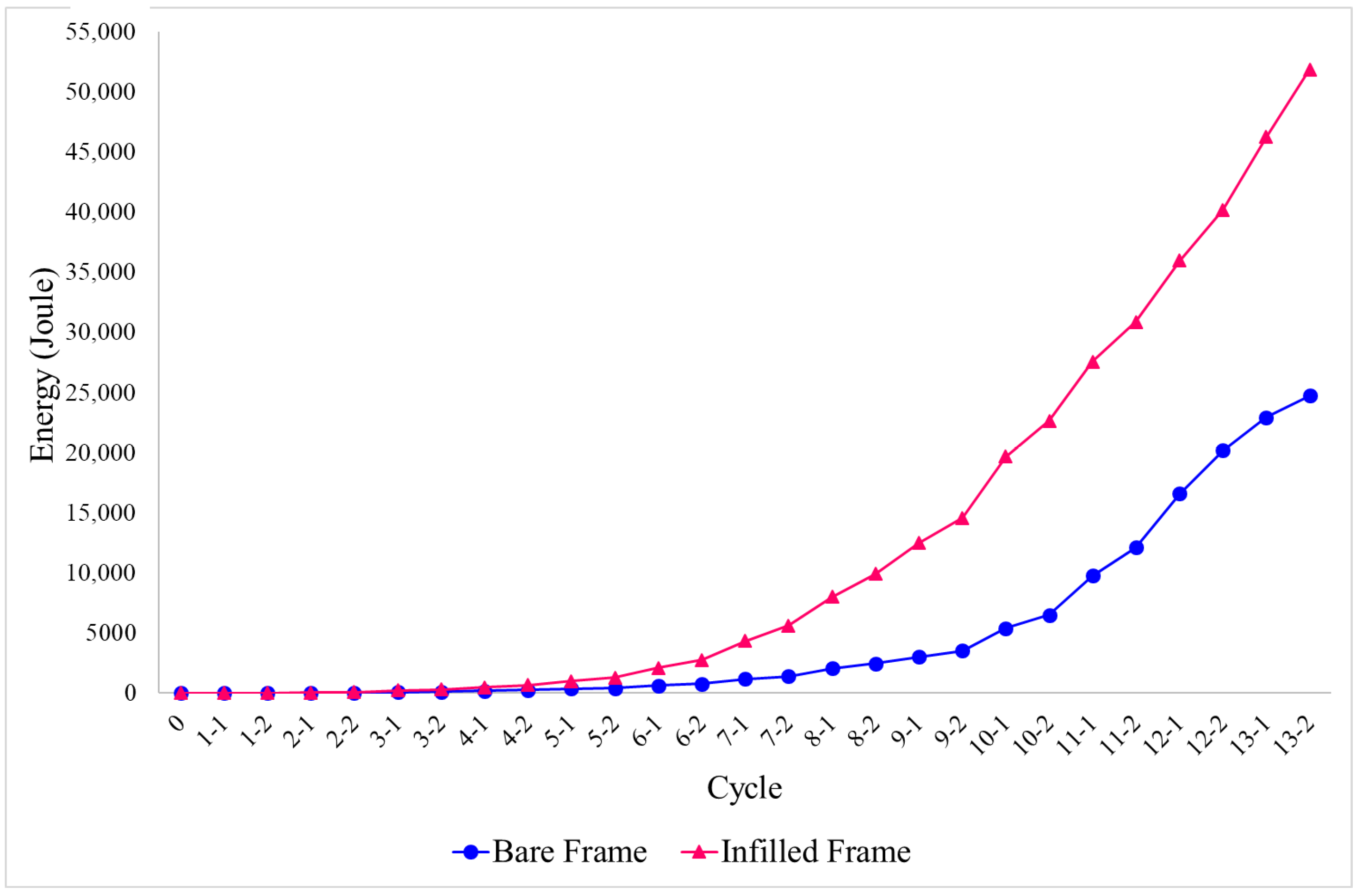 - The infilled frame exhibited energy dissipation capacity, primarily derived from the progressive degradation of the drywall system (crushing and tearing). Additionally, minor shear cracking was observed in the beam–column joints, which ceased to propagate once the infill failed. Thus, the observed energy absorption is strictly a consequence of the non-structural element’s failure process and its interaction with the frame joints.