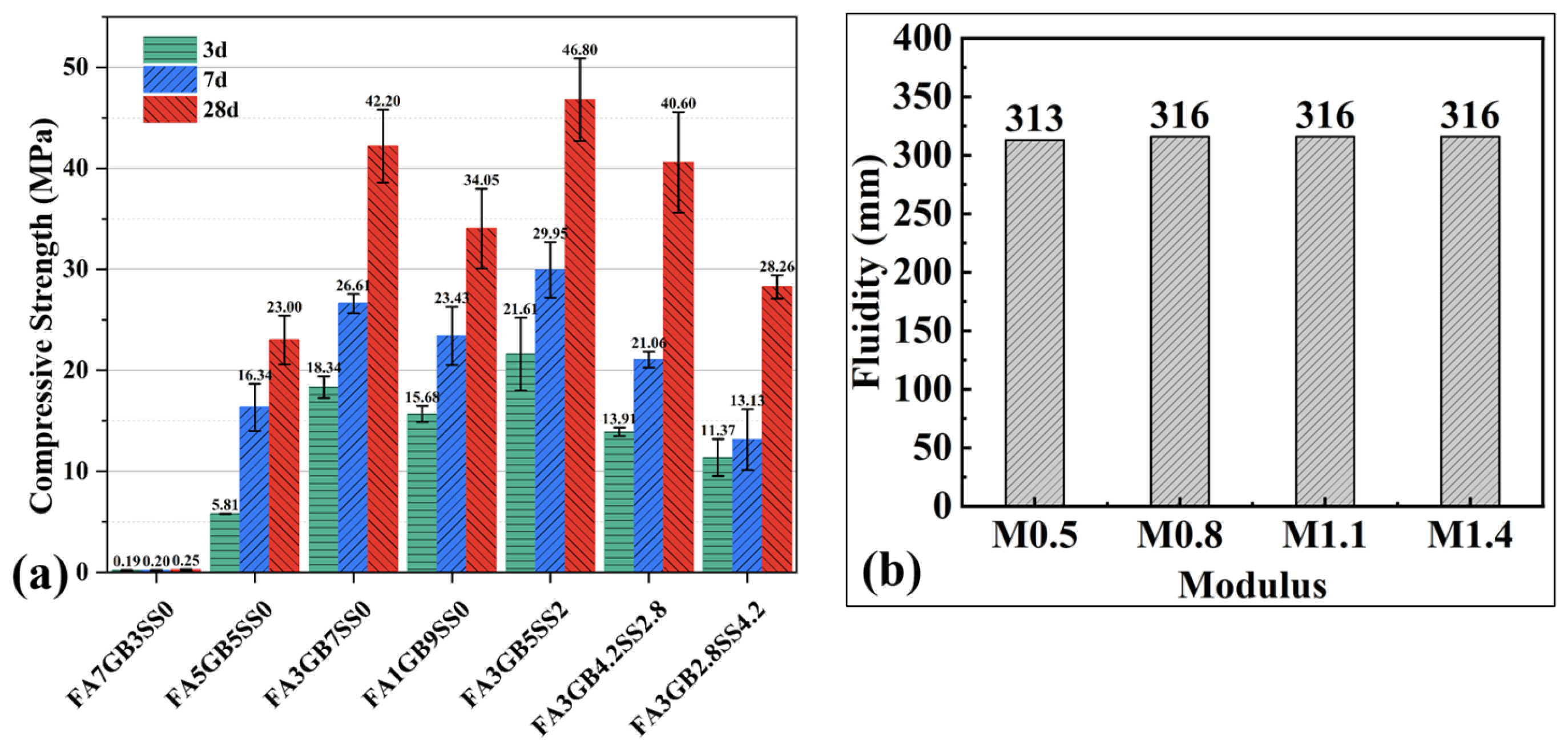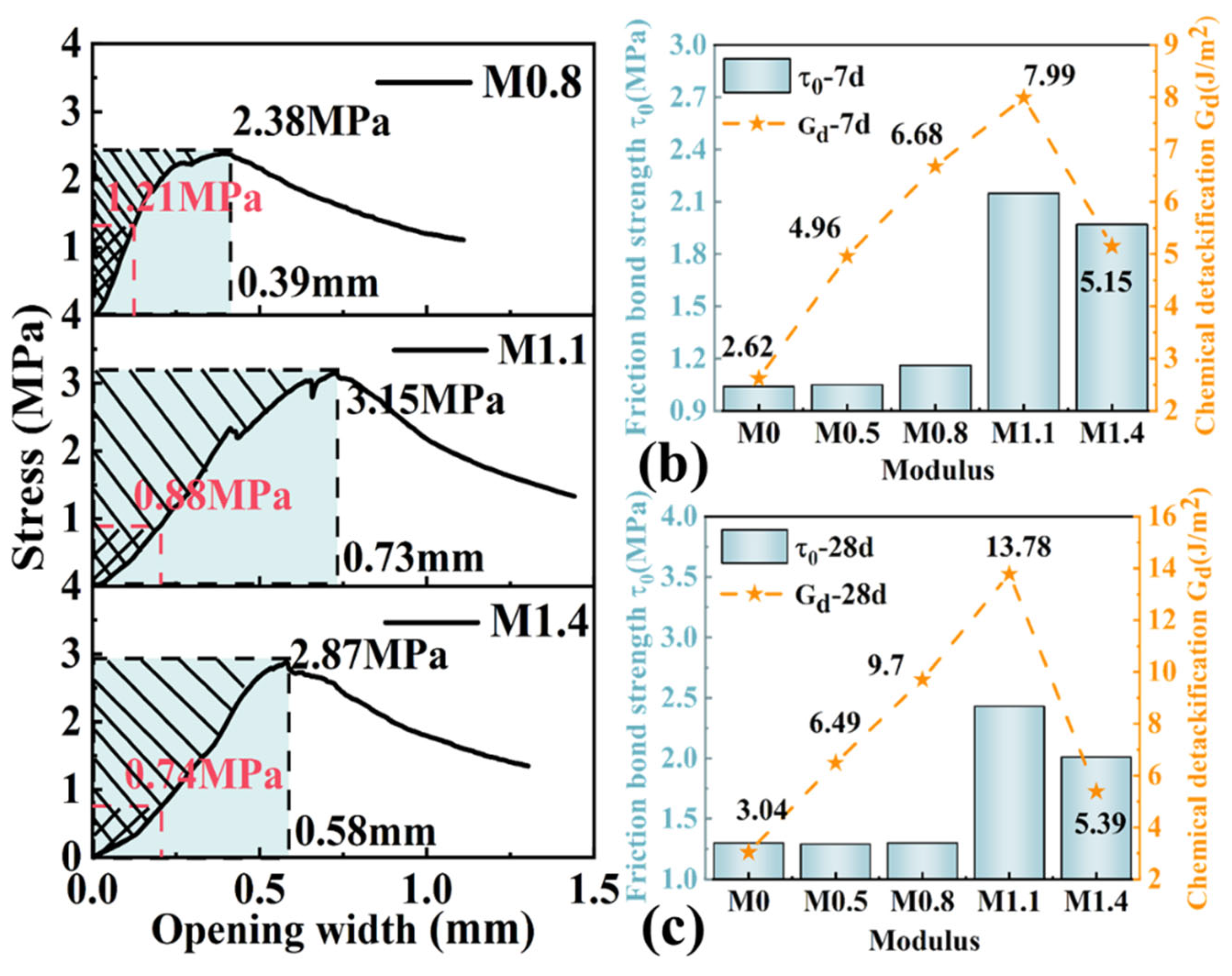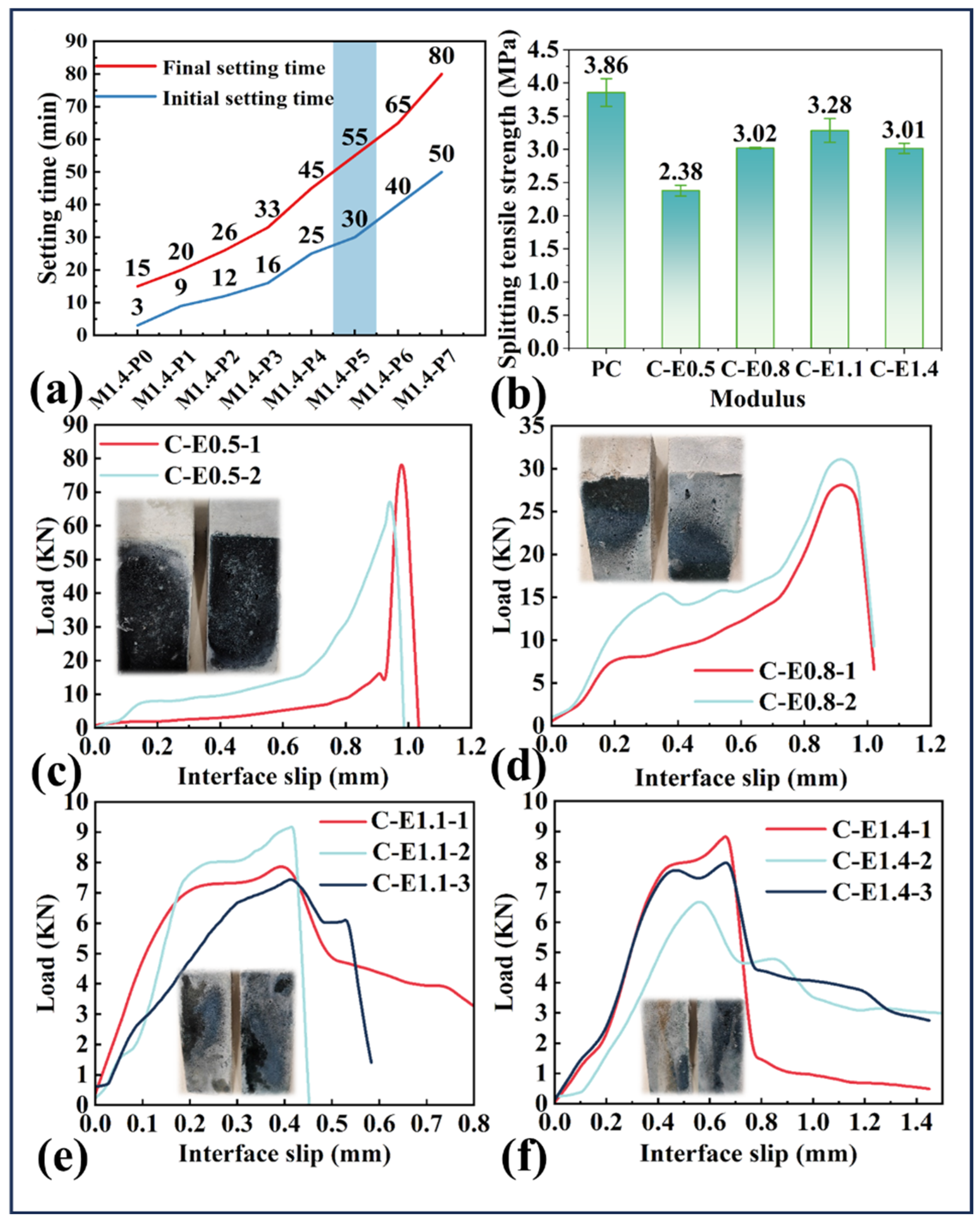 - Slant shear and splitting tensile tests showed that Ms strongly influences interfacial bonding with concrete. Moderate moduli (1.0–1.1) ensured strong adhesion and balanced composite strength, while excessive modulus (1.4) led to porous ITZ and degraded bond performance.