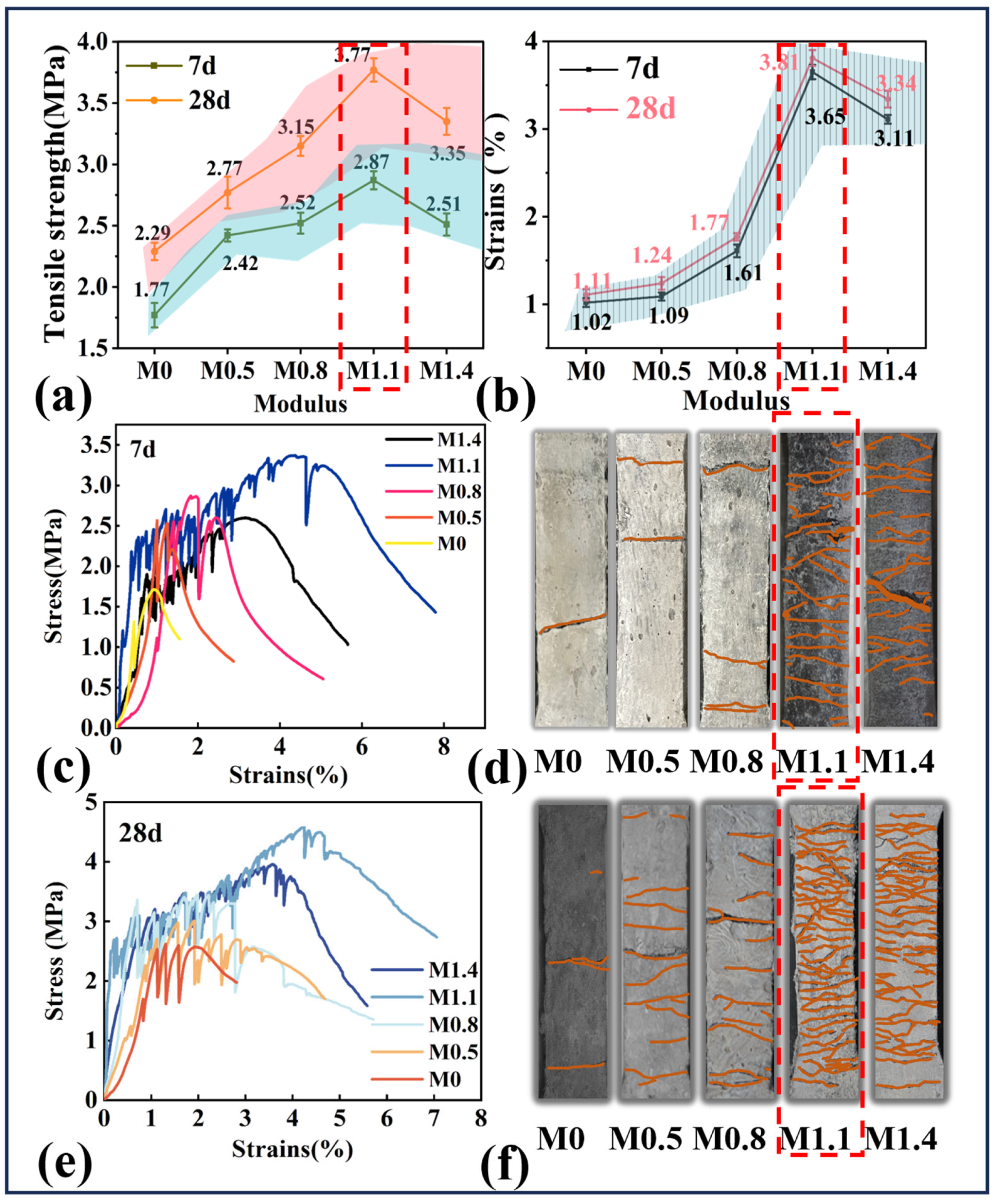- The activator modulus significantly affects the tensile properties of AAM. At Ms = 1.1, the composite achieved the maximum tensile strength (3.77 MPa) and ultimate tensile strain (3.68%) at 28 days, corresponding to increases of 231% and 64.6% compared with Ms = 0.