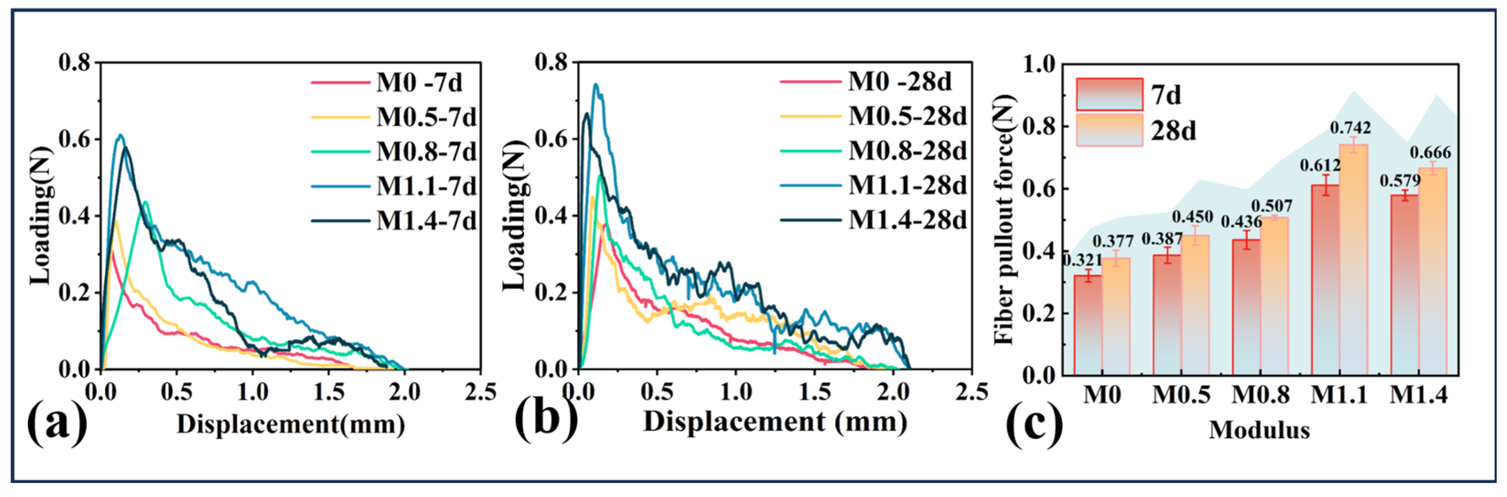 - Single-fiber pull-out tests revealed that Ms = 1.1 provided optimal interfacial frictional bond strength, facilitating controlled fiber pull-out rather than premature rupture. This mechanism enables fibers to bridge more cracks and sustain tensile loading.