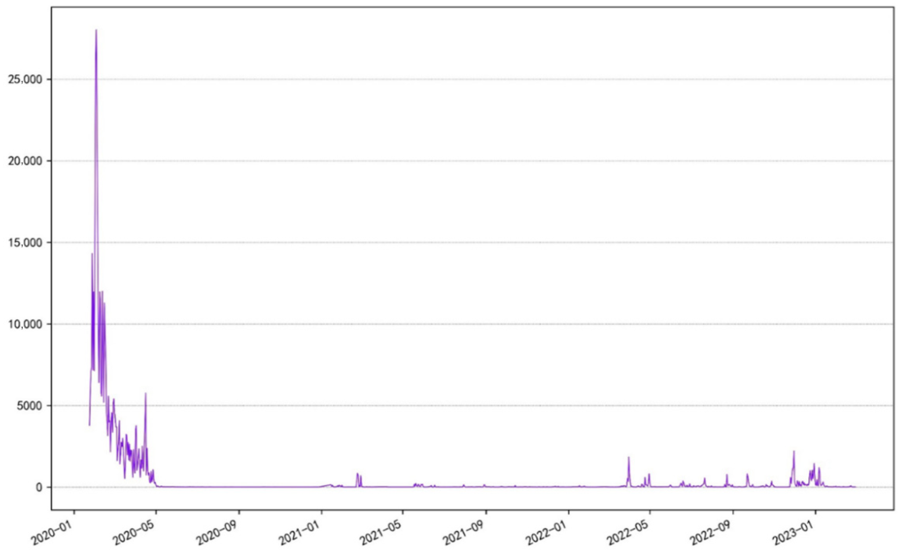 Figure 2, the comments on EIPs began in January 2020 and surged from January to May 2020, with daily comments consistently remaining at a high level, including 64 days with more than 2000 comments per day and 27 days recording between 500 and 2000 comments. Starting from 24 January 2020, the amount of comment data gradually increased, reaching its peak on 3 February 2020, with 28,027 comments, followed by sustained fluctuations and decreases. Since May 2020, the number of comments has remained at a relatively low level with daily comments numbering less than 850. Moreover, from April 2022 to March 2023, the number of daily comments showed fluctuating increases in certain periods but peaked below 2500 each day, which is consistent with previous studies such as those of Cui and Kertész [
