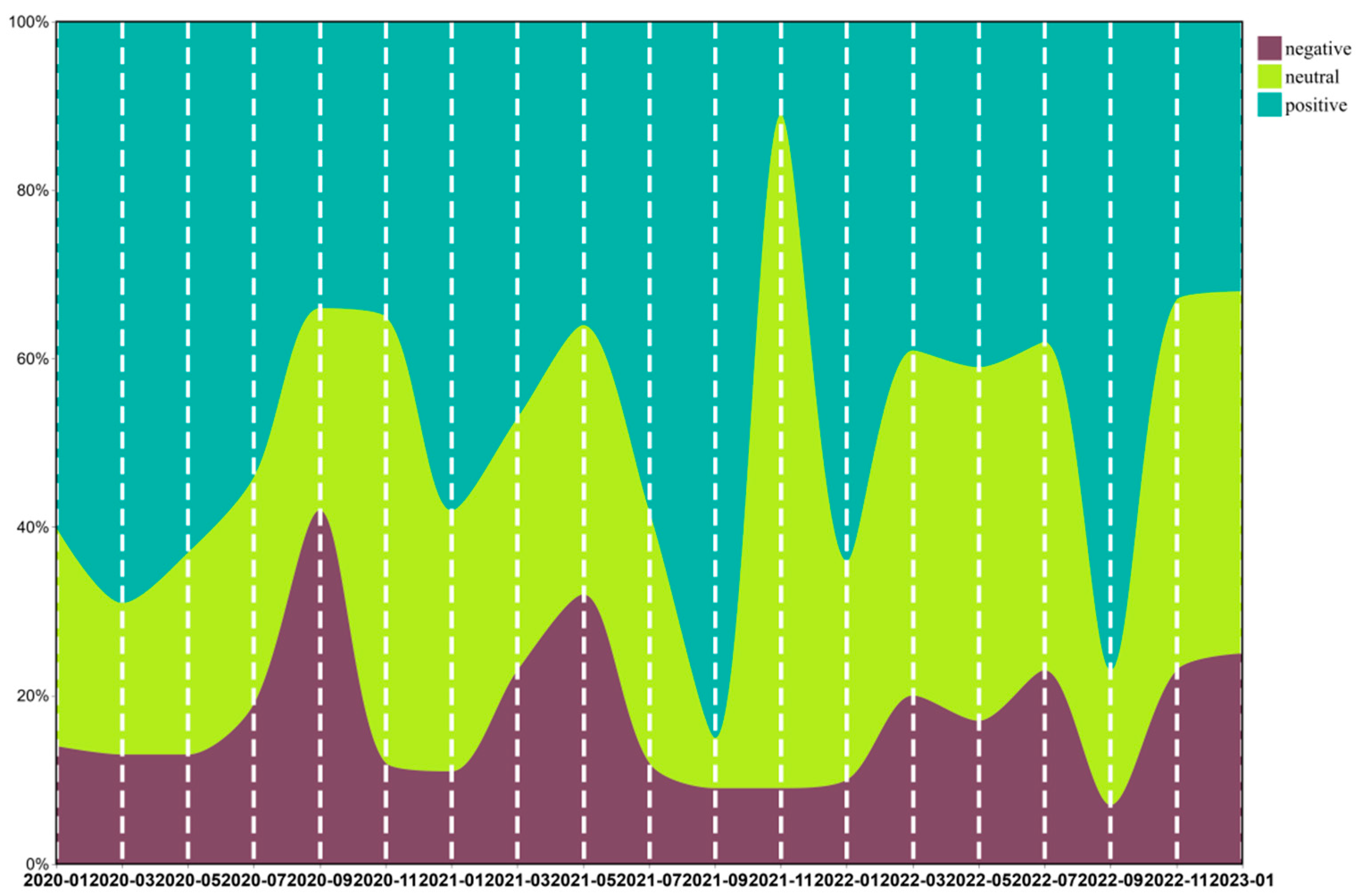 41], public sentiment in online environments is significantly influenced by specific events in the real world. Therefore, the proportion of positive sentiment began to rise steadily from January 2020 and reached a peak of approximately 65% in March 2020. This increase is likely related to the construction and commissioning of Leishenshan Hospital and Huoshenshan Hospital, as well as the continuous responses of the Hubei Provincial Government and Wuhan Municipal Government to public concerns. Subsequently, positive sentiment gradually declined while negative sentiment increased. Between September and November 2020, the proportion of positive sentiment remained at a relatively low level, ranging from 30% to 50%, with negative sentiment exceeding 30%. This shift was primarily attributed to localised resurgences of the pandemic and the occurrence of trademark squatting incidents related to the pandemic, which triggered public dissatisfaction. Subsequently, in April and May of 2021, this indicator remained within the same range. Since then, the proportion of positive sentiment has exhibited a growing trend, reaching its peak of 85% in September 2021. The rise in the public’s positive emotions toward EIPs may be related to positive signals from other countries. For instance, Denmark announced that it would no longer classify COVID-19 as a “serious threat to society” [