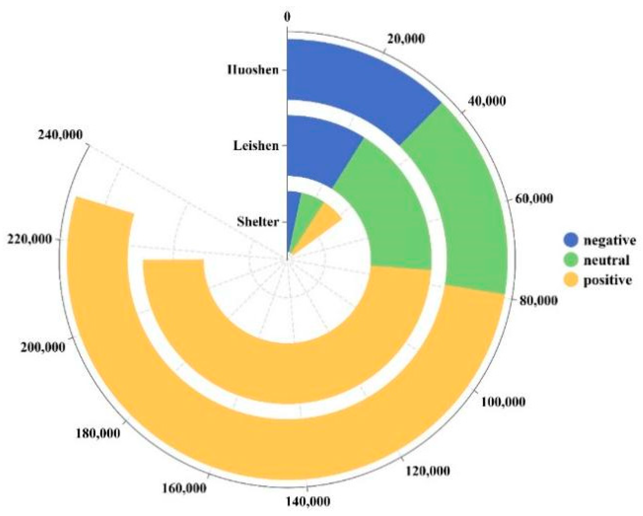 Figure 6 illustrates the public sentiment distribution across different project types. The number of comments about Huoshenshan Hospital, Leishenshan Hospital and mobile cabin hospitals are 229,366, 215,824 and 45,959, respectively. The corresponding positive sentiment for these projects in sequence are 65%, 65% and 39%, while the negative sentiment sequence is 16%, 18% and 22%.