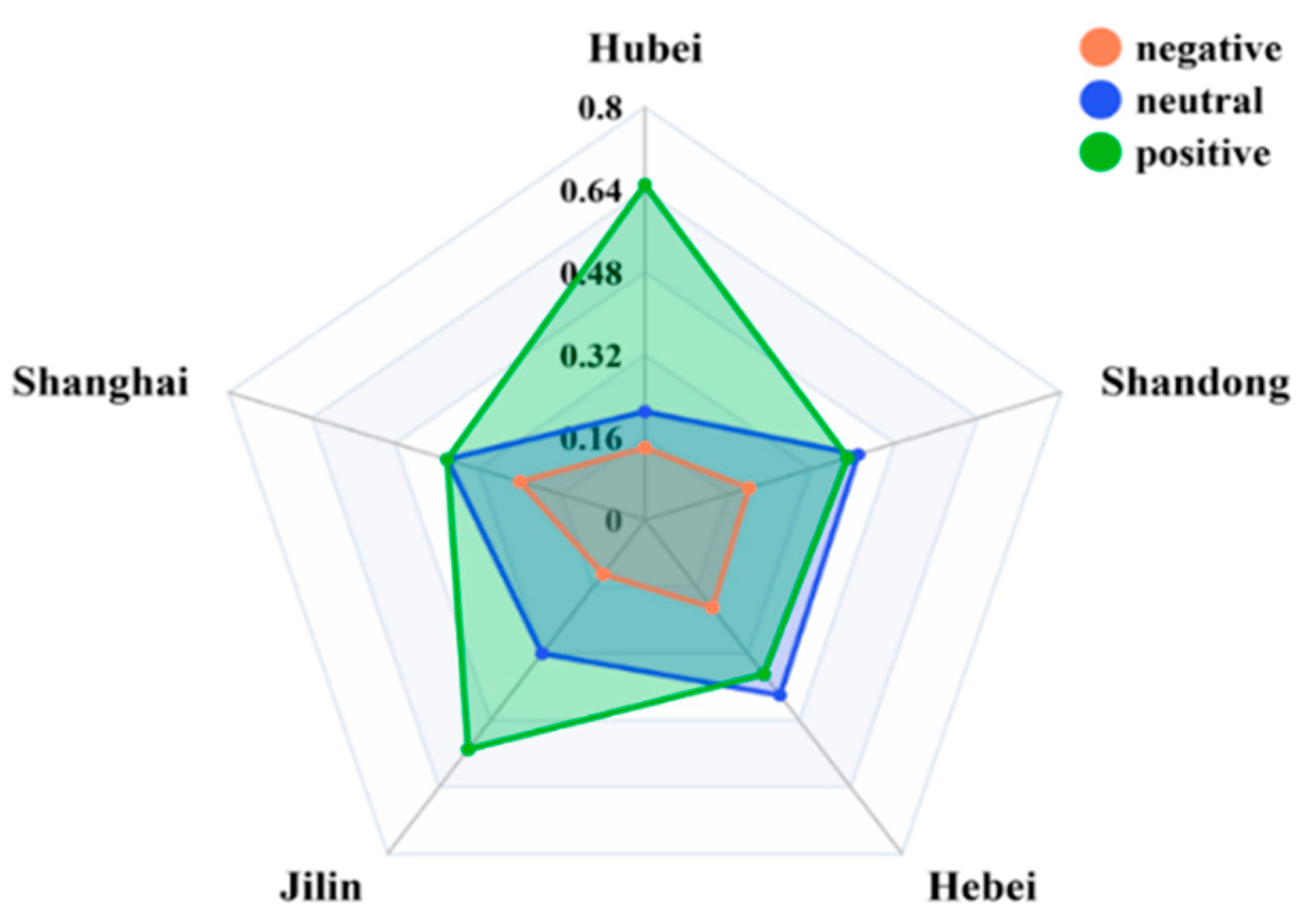 In this study, the data collected originate from several regions, including Hubei Province (specifically Wuhan City), Hebei Province, Jilin Province, Shandong Province and Shanghai City. The regional radar charts illustrating public sentiment proportions are presented in