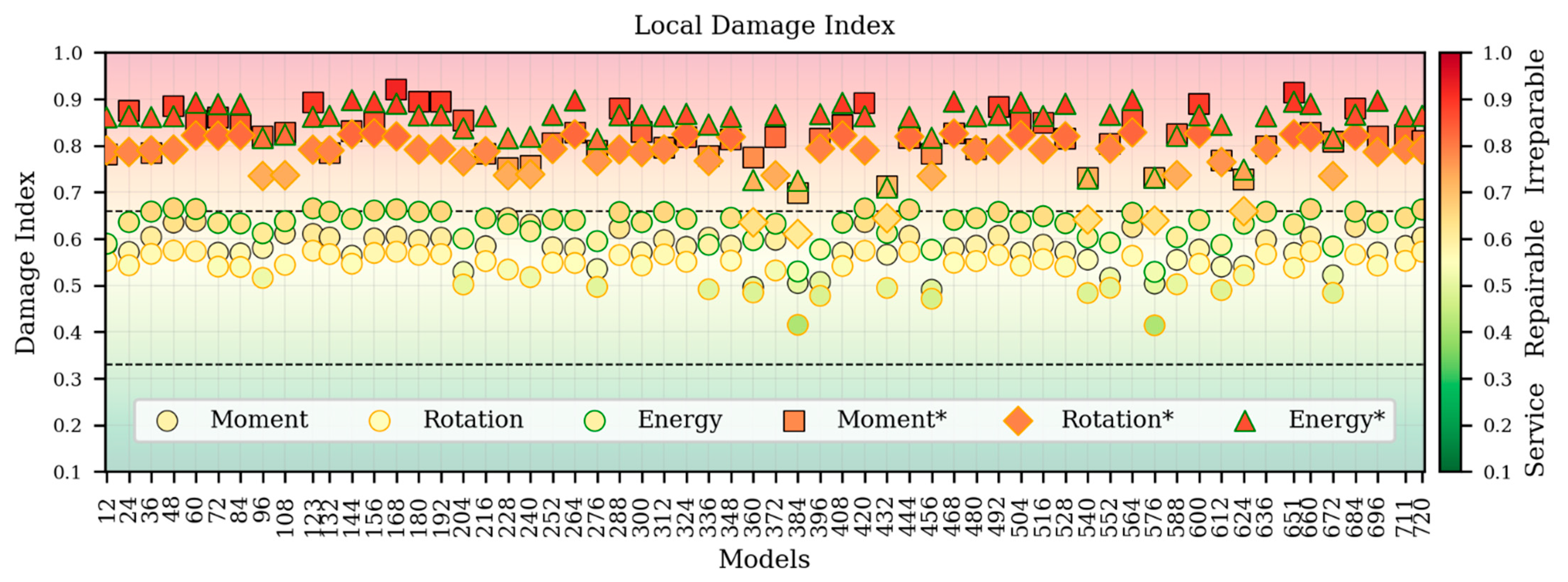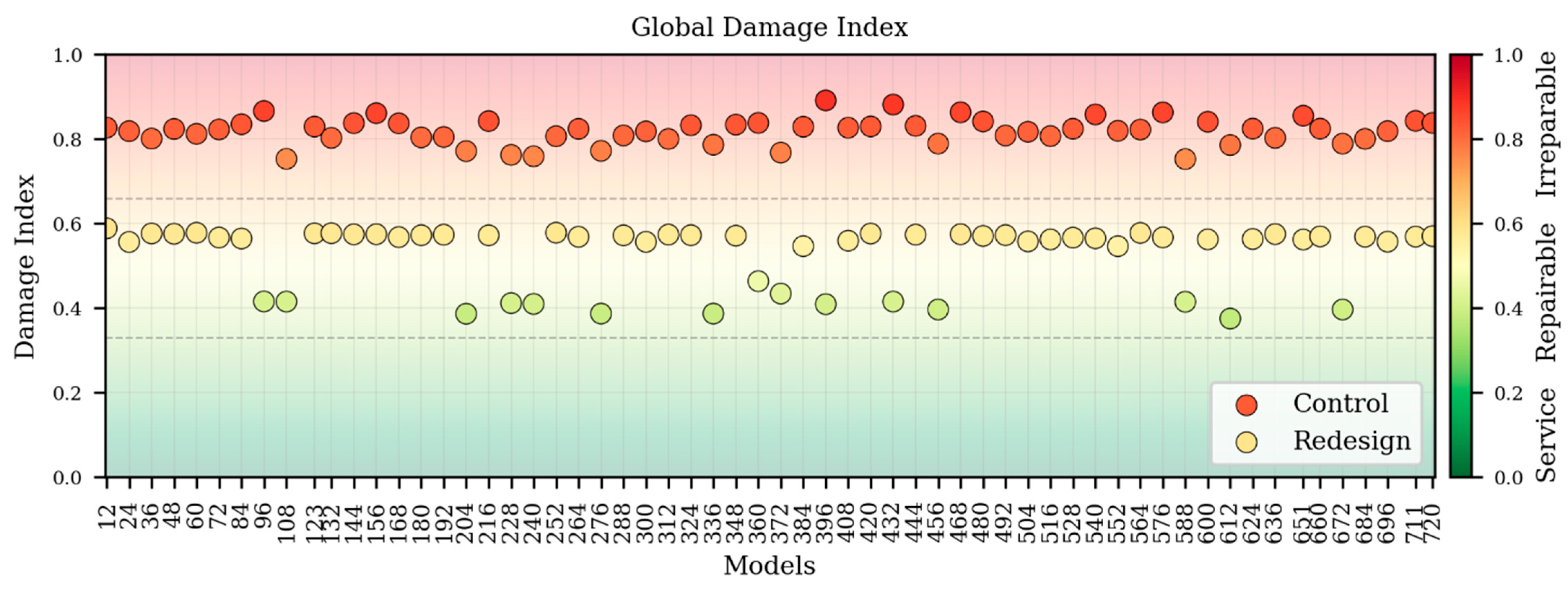 3.3.5. Global Damage Index (GDI)