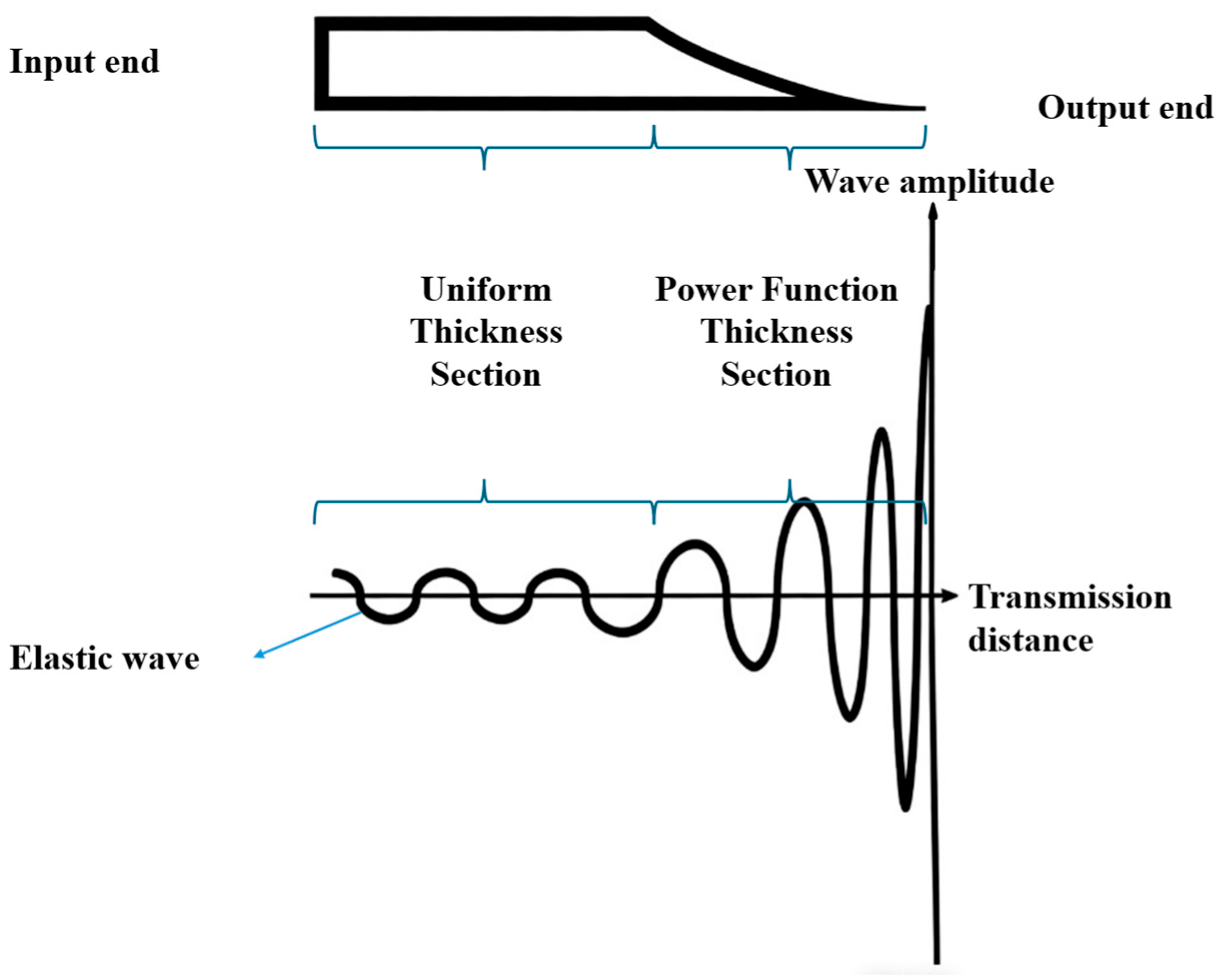 23]. By specifically designing the thickness profile of a structure or altering its material properties, the wave propagation speed gradually decreases as thickness diminishes, while the regional wave number progressively increases with thickness. Under ideal conditions—where the structure exhibits total internal reflection at its boundaries and the plate thickness gradually diminishes to zero—elastic waves will concentrate along the thickness direction at the zero-thickness point, achieving zero reflection along the length. This principle is illustrated in