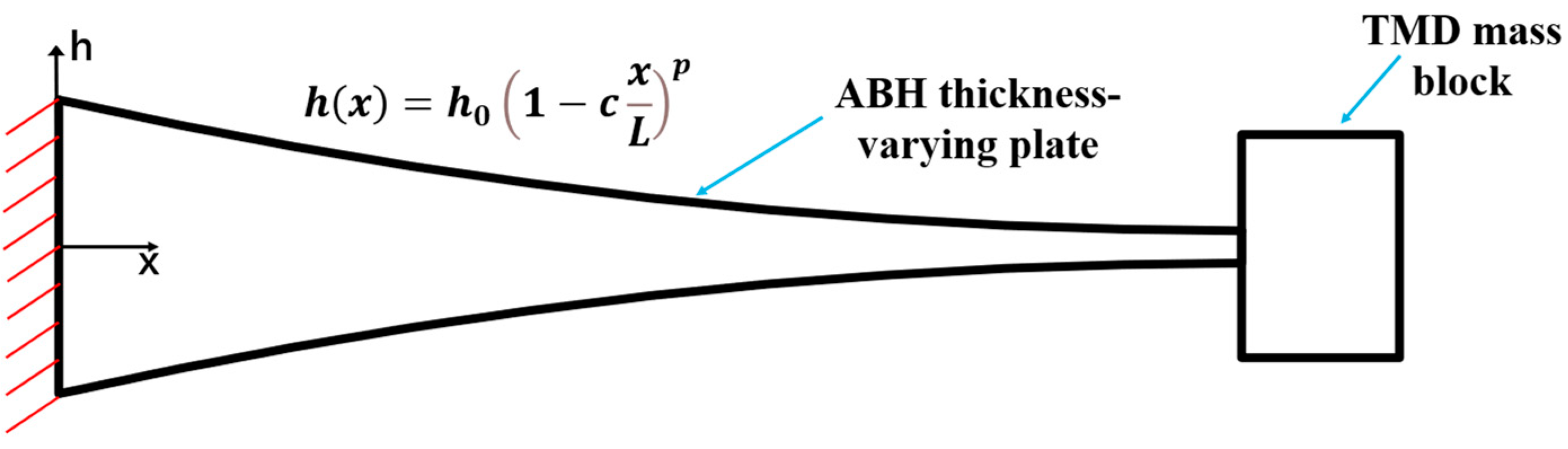 For the proposed ABH-TMD structure in this paper, the configuration involves placing an additional TMD mass block at the tip of the ABH varying-thickness plate. Let the extension direction of ABH thickness variation be