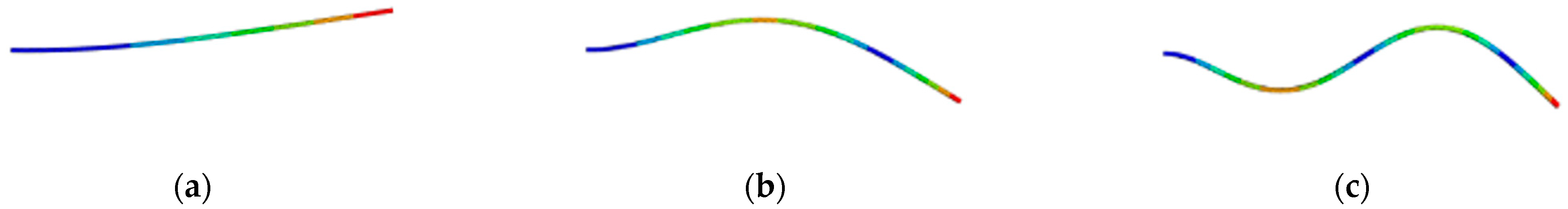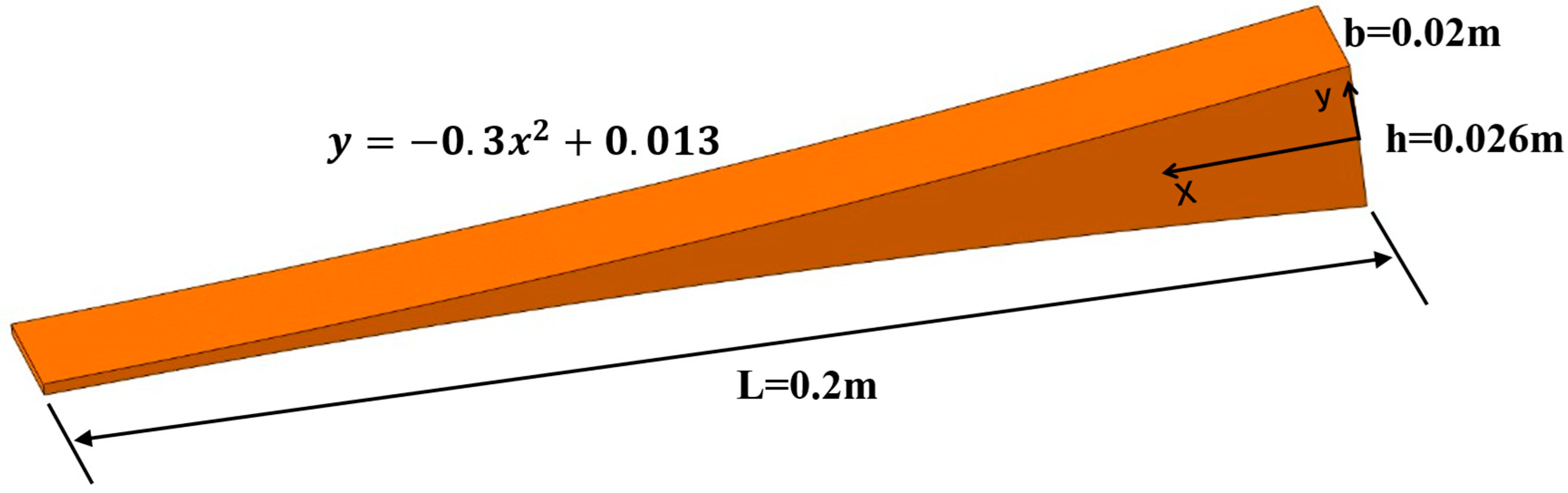 Therein, represents Young’s modulus, is the material density, signifies Poisson’s ratio, and indicates the local thickness of the beam.