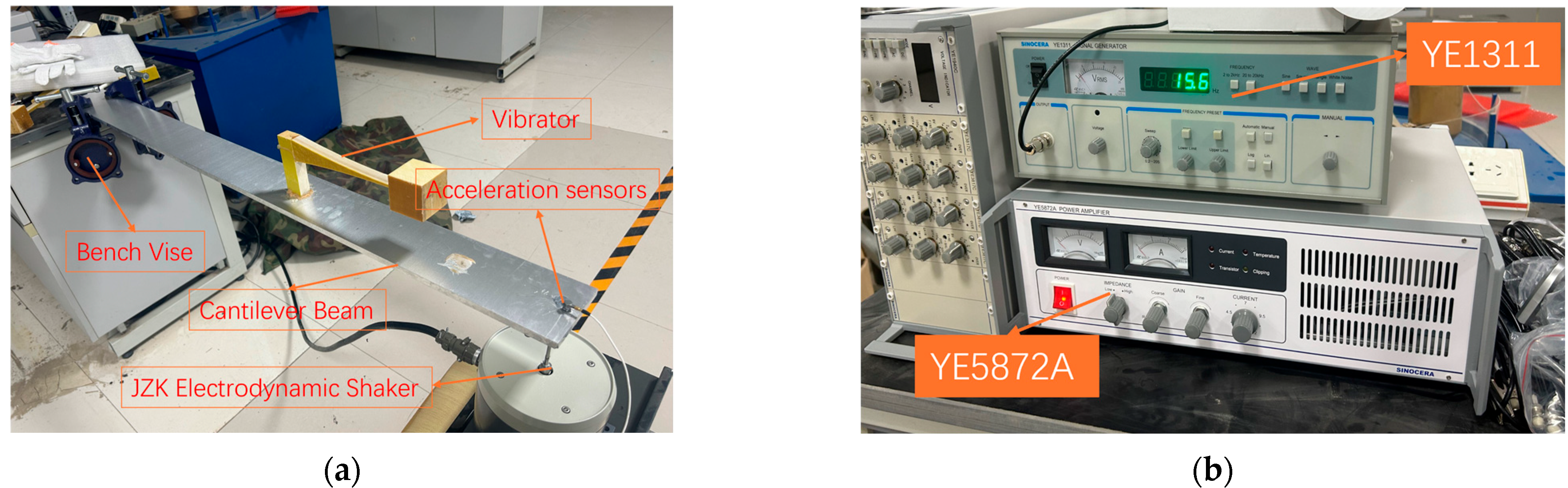 Section 2.3. The cantilever beams were secured using vise clamps, and the TMD and ABH-TMD vibrators were bonded to the main structure using AB adhesive. For the experimental excitation load, a YE1311 signal generator (Sinocera Piezotronics INC., Beijing, China) was used to establish the excitation form and frequency, transmitting electrical signals to the YE5872A power amplifier (Sinocera Piezotronics INC.), which adjusted the amplitude of the input vibration excitation. The YE5872A was connected to a JZK electric vibrator (Sinocera Piezotronics INC.), whose piston rod was fixed to the bottom of the cantilever beam’s free end. The input1 excitation was a sinusoidal function with an amplitude of 1 mm and a frequency range of 2 Hz to 14 Hz. The signal acquisition system employed a Picoscope 2124 eight-channel PC-based digital oscilloscope (Pico Technology Ltd., St. Neots, UK) to transmit collected data to a PC. An accelerometer probe with a sensitivity of 10 mV/g was positioned at the top surface of the cantilever beam’s free end to capture voltage signals. The experimental setup is illustrated in