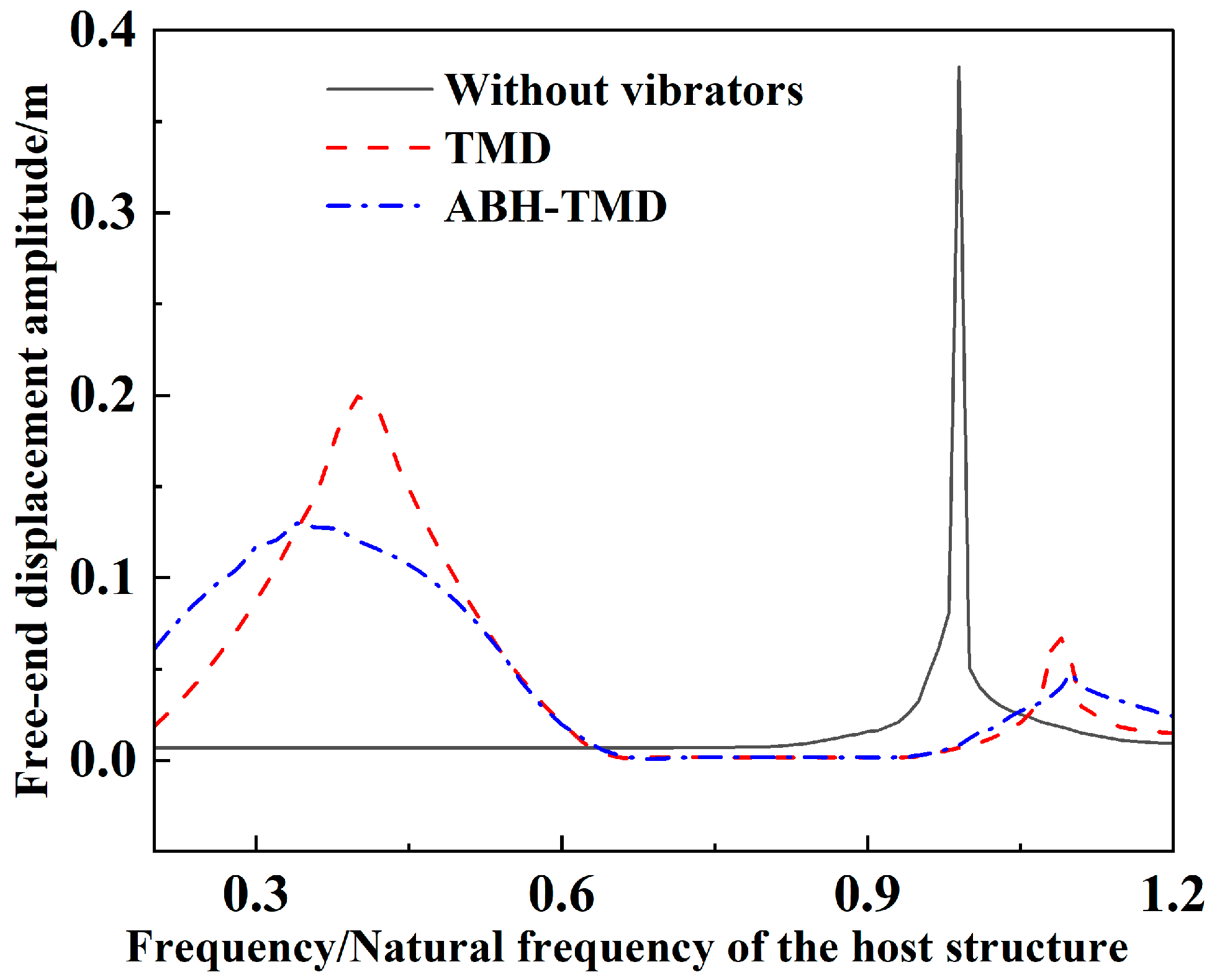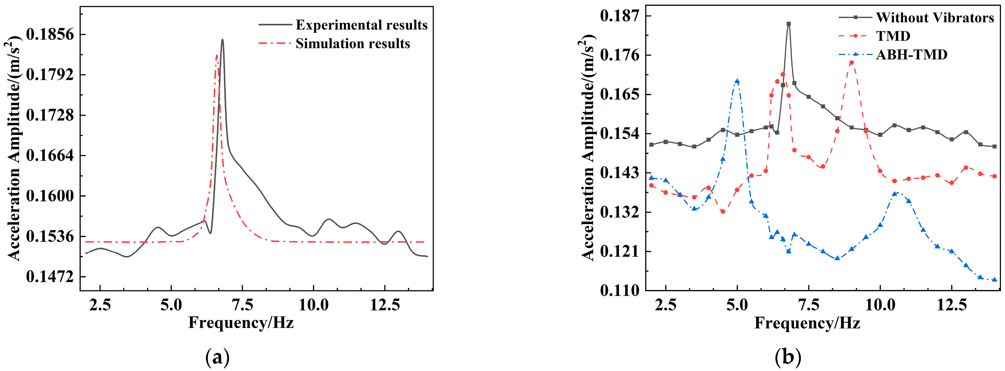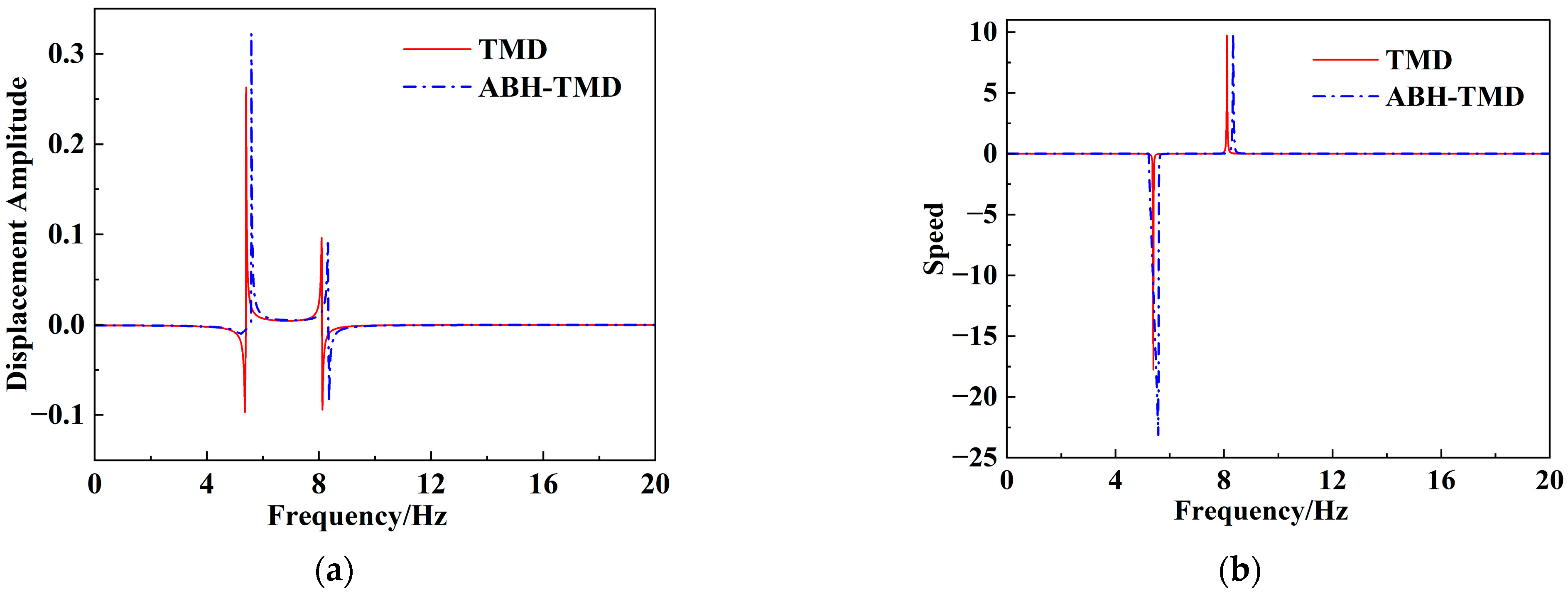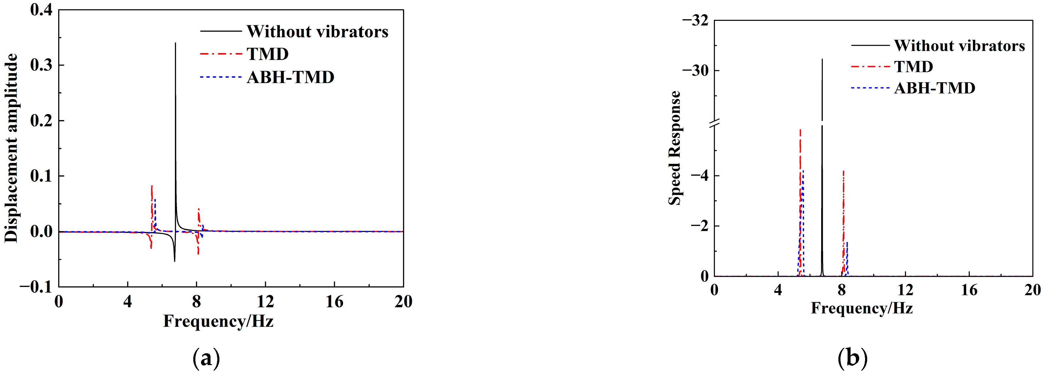 2 at a frequency of 6.8 Hz. After installing the TMD and ABH-TMD vibrators, the resonance peak of the cantilever beam clearly splits into two distinct peaks. Under TMD control, these appeared at 0.1706 m/s