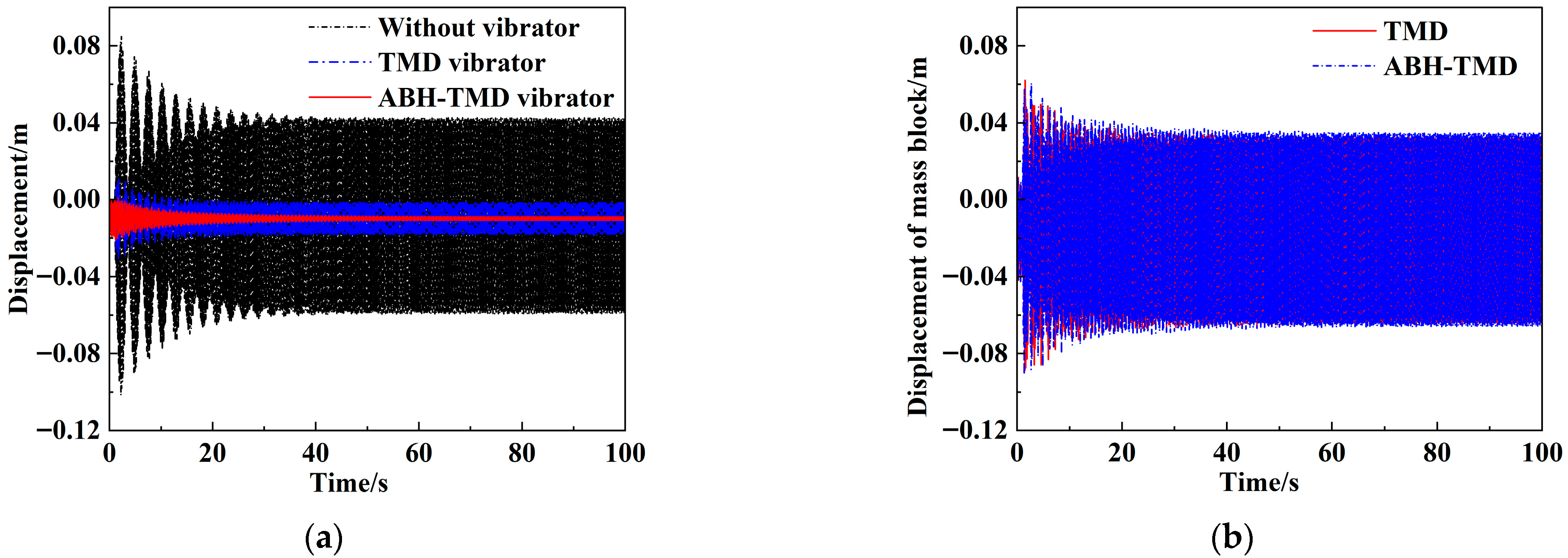 In TMD measures, the natural frequency of the secondary vibrating structure (vibrator) must be close to that of the host structure to achieve dynamic damping effects and reduce the vibration amplitude in the target frequency band. Therefore, when configuring the vibrators, the first-order natural frequencies of both the ABH-TMD and TMD were established akin to that of the host structure.